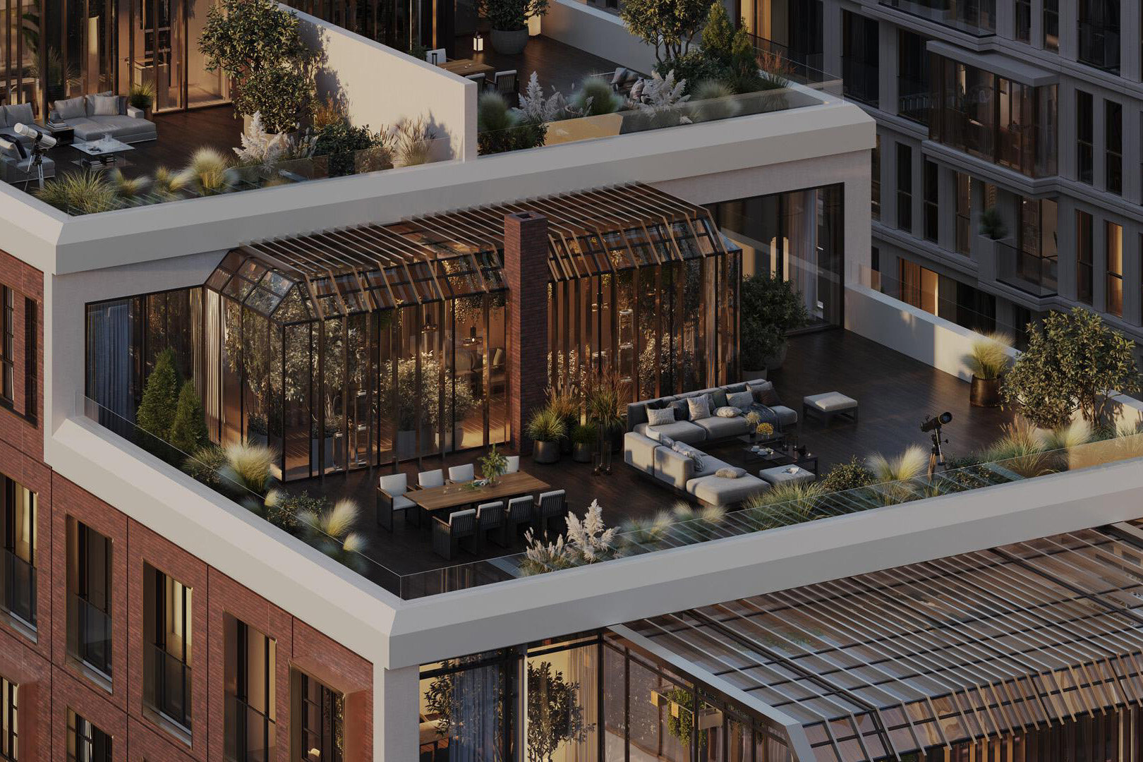 В комплексе представлены 1–4-комнатные квартиры площадью от 35,9 до 194 кв.м. Есть планировки с французскими балконами, постирочными, гардеробными, кухнями-нишами, угловым остеклением, мастер-спальнями. Изюминка проекта — квартиры с террасами площадью от 24 до 150 кв. м. Террасы будут трёх видов: открытые, угловые с эркером и красивыми видами, а также частично застеклённые террасы, где можно устроить собственную оранжерею, домашний спа-центр или творческую мастерскую.