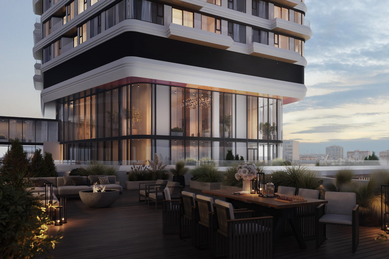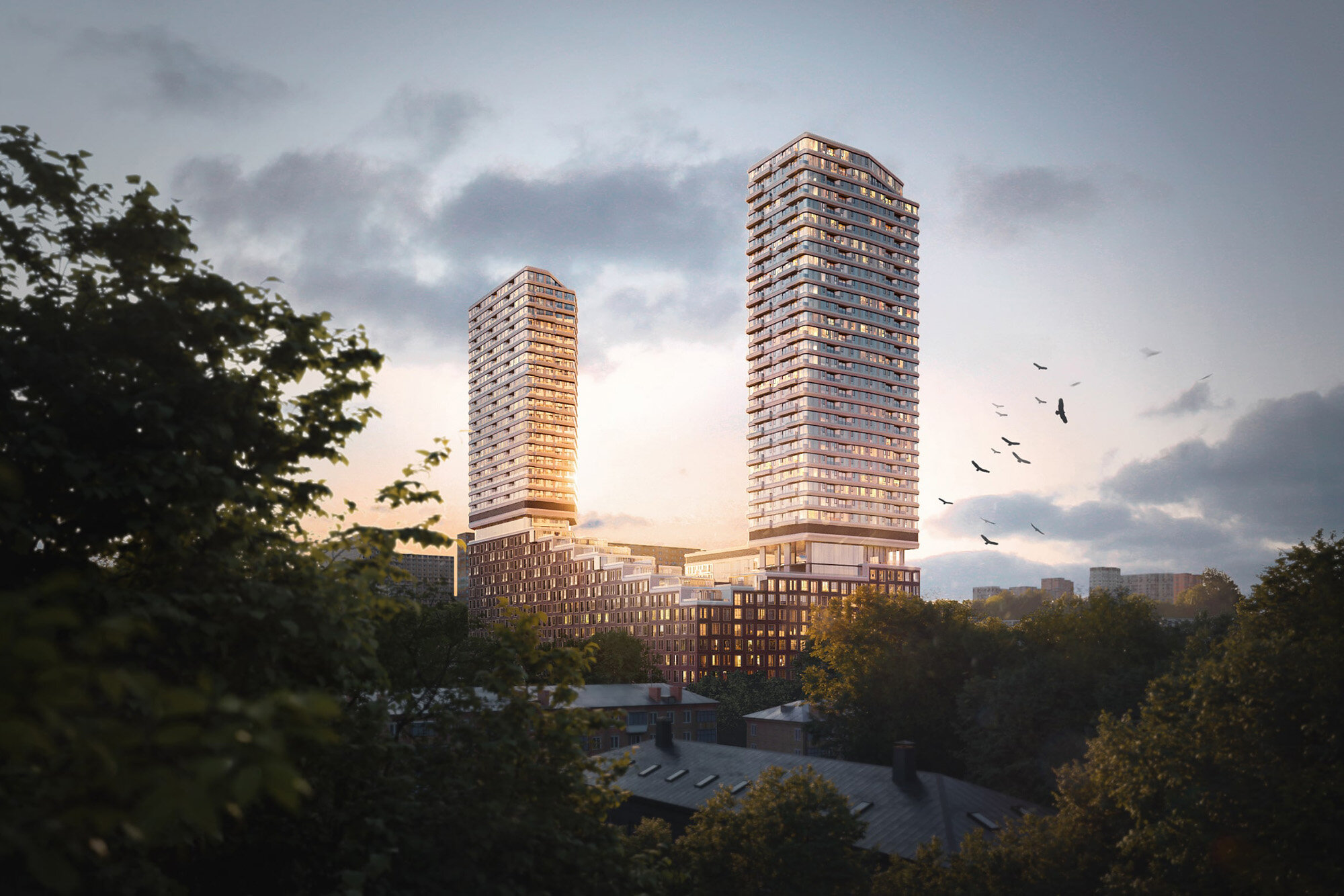 Здания объединяет двухуровневый стилобат, где откроются магазины, офисы и детский развивающий центр. В корпусах будут просторные лобби c зонами ожидания, библиотеками и кофейнями самообслуживания. На подземном уровне разместится паркинг на 115 машиномест. Во дворе появятся пешеходные аллеи, газоны, зоны отдыха.