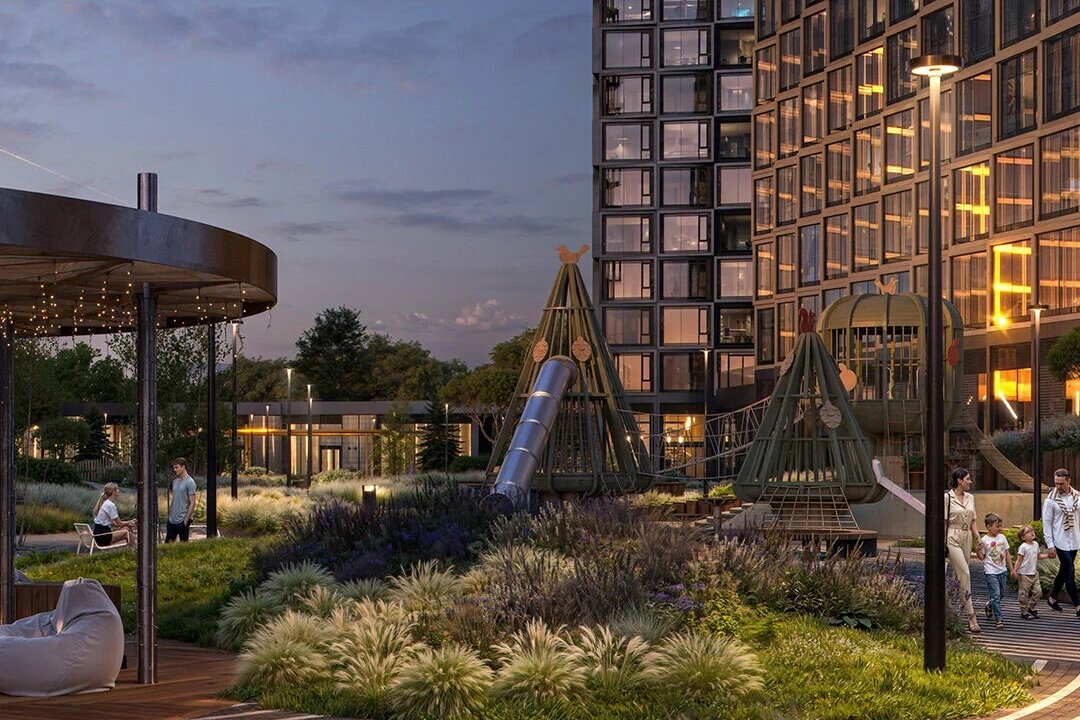 Внутри комплекса запланирован ландшафтный парк с всесезонным озеленением, променадом у воды, «парящим» мостом, амфитеатром, обогреваемыми в холодное время дорожками для прогулок, детскими и спортивными площадками, местами для барбекю и пикников, площадками для выгула собак. В корпусах предусмотрено несколько общественных зон: спортивная студия, фитнес-центр с бассейном и джакузи, коворкинг и лаунж-зоны, общественная гостиная с мини-кухнями, детские и подростковые игровые комнаты, кафе, рестораны, магазины и бытовые сервисы.