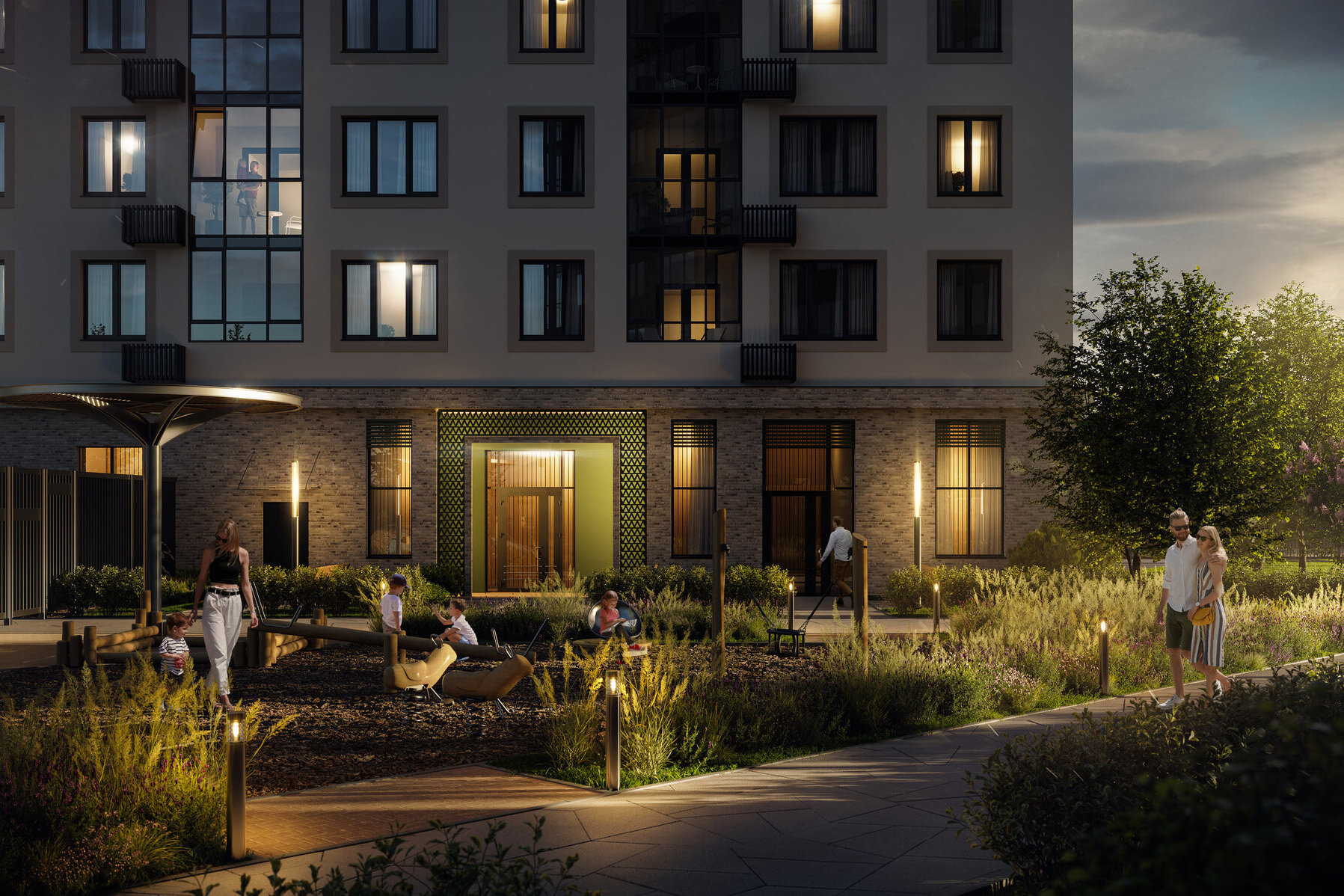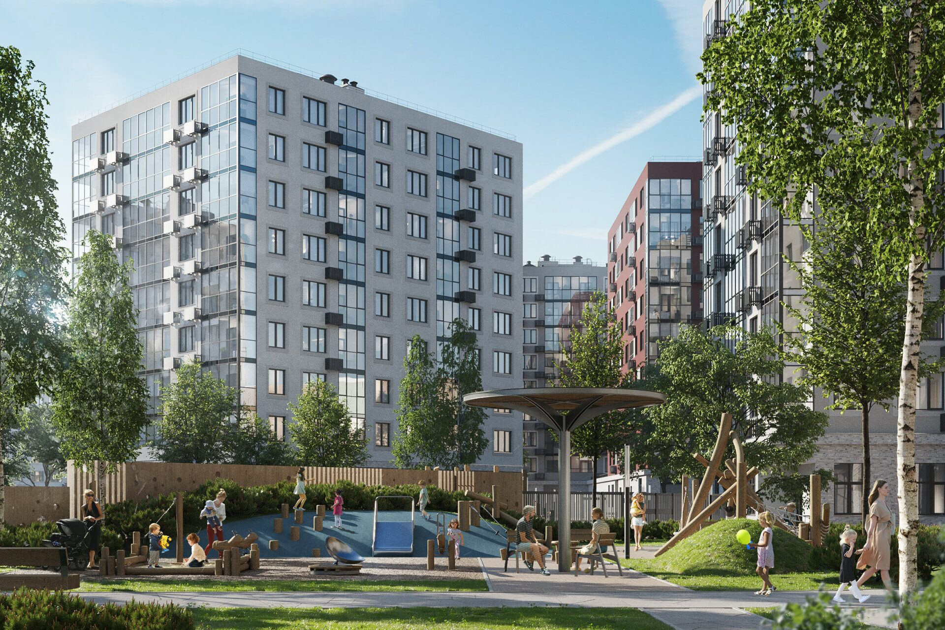 В состав комплекса войдут восемь детских садов на 2 тыс. детей, три школы на 2,9 учеников, а также магазины, аптеки, кафе, пекарни, различные сервисы. На территории появятся игровые и спортивные площадки, места для отдыха, пешеходные бульвары. Подъезды будут расположены на уровне земли — для удобства маломобильных граждан. В домах оборудуют колясочные и лапомойки, установят бесшумные лифты. На подземных этажах разместятся кладовые для сезонных вещей и паркинг.