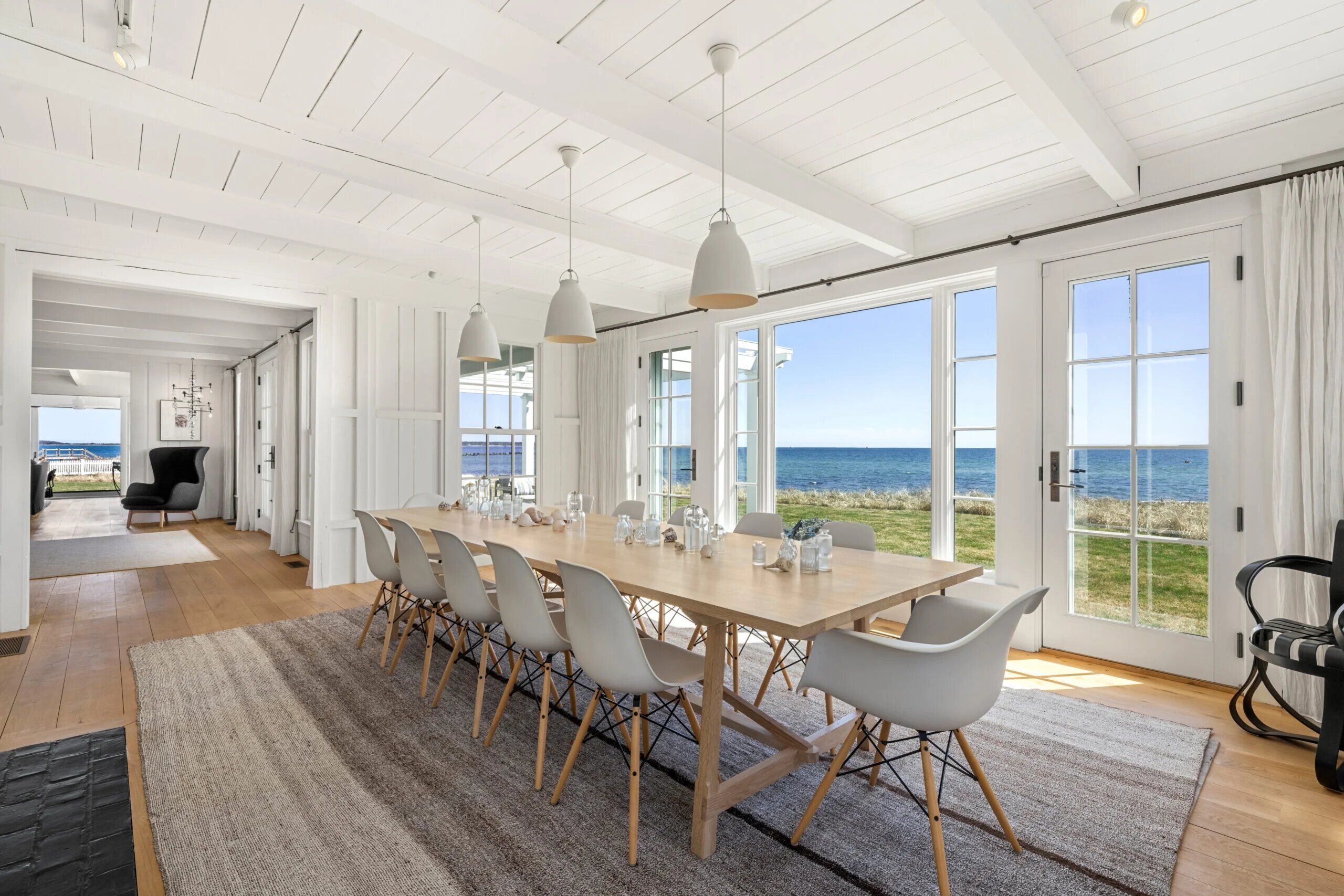 Сердцем большого дома можно считать просторную столовую с французскими дверями и видом на залив Нантакет: здесь хватит места и для посиделок в семейном кругу, и для вечеринки со множеством гостей.