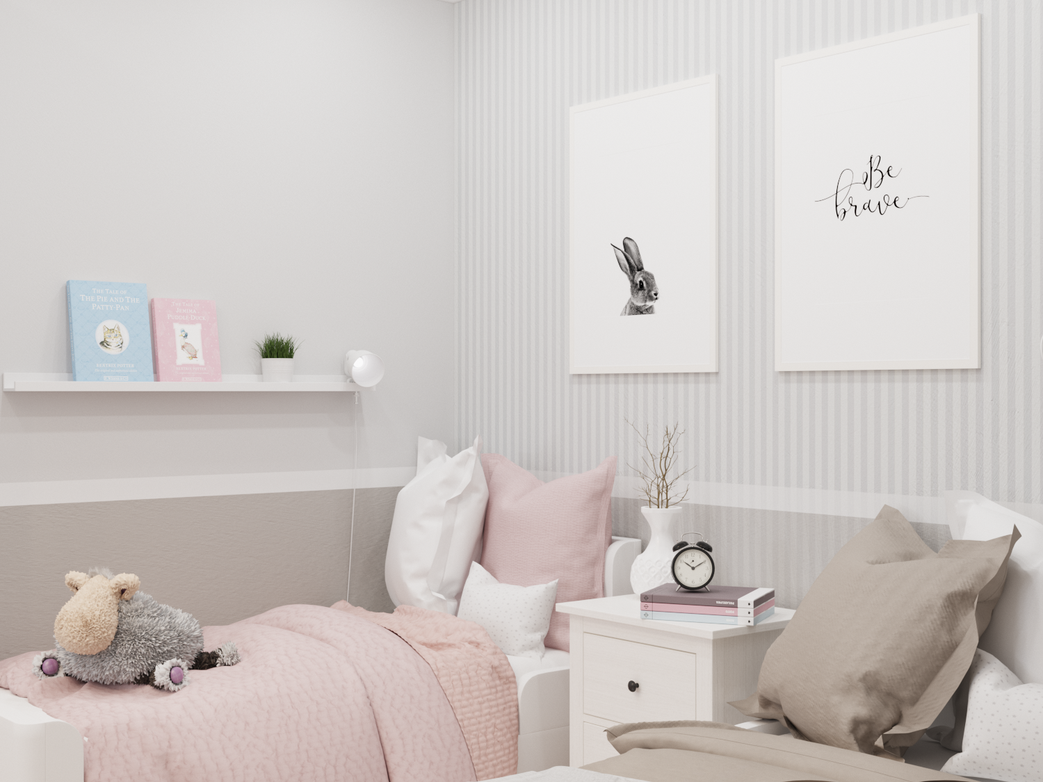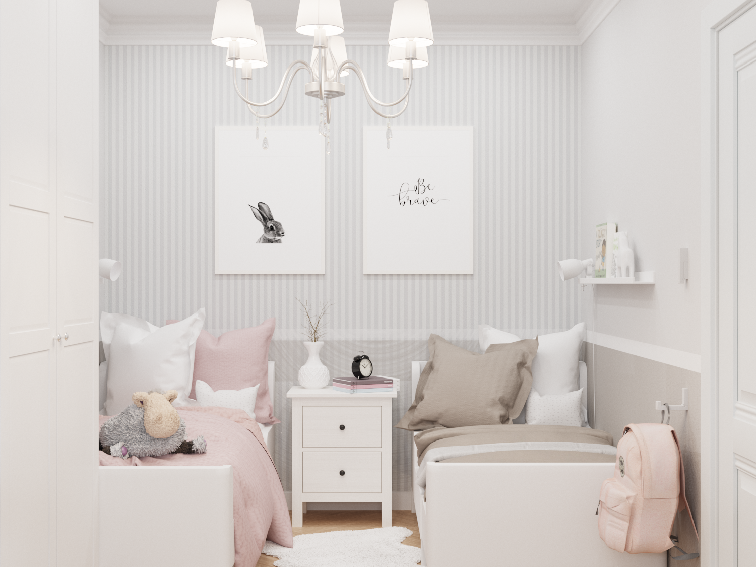 Пример стилистического оформления такой квартиры можно посмотреть на визуализациях детской комнаты. Отметим, что интерьер допустимо сделать с другими акцентами, главное, чтобы в качестве базовых использовались светлые цвета, а сама квартира не была перегружена мебелью