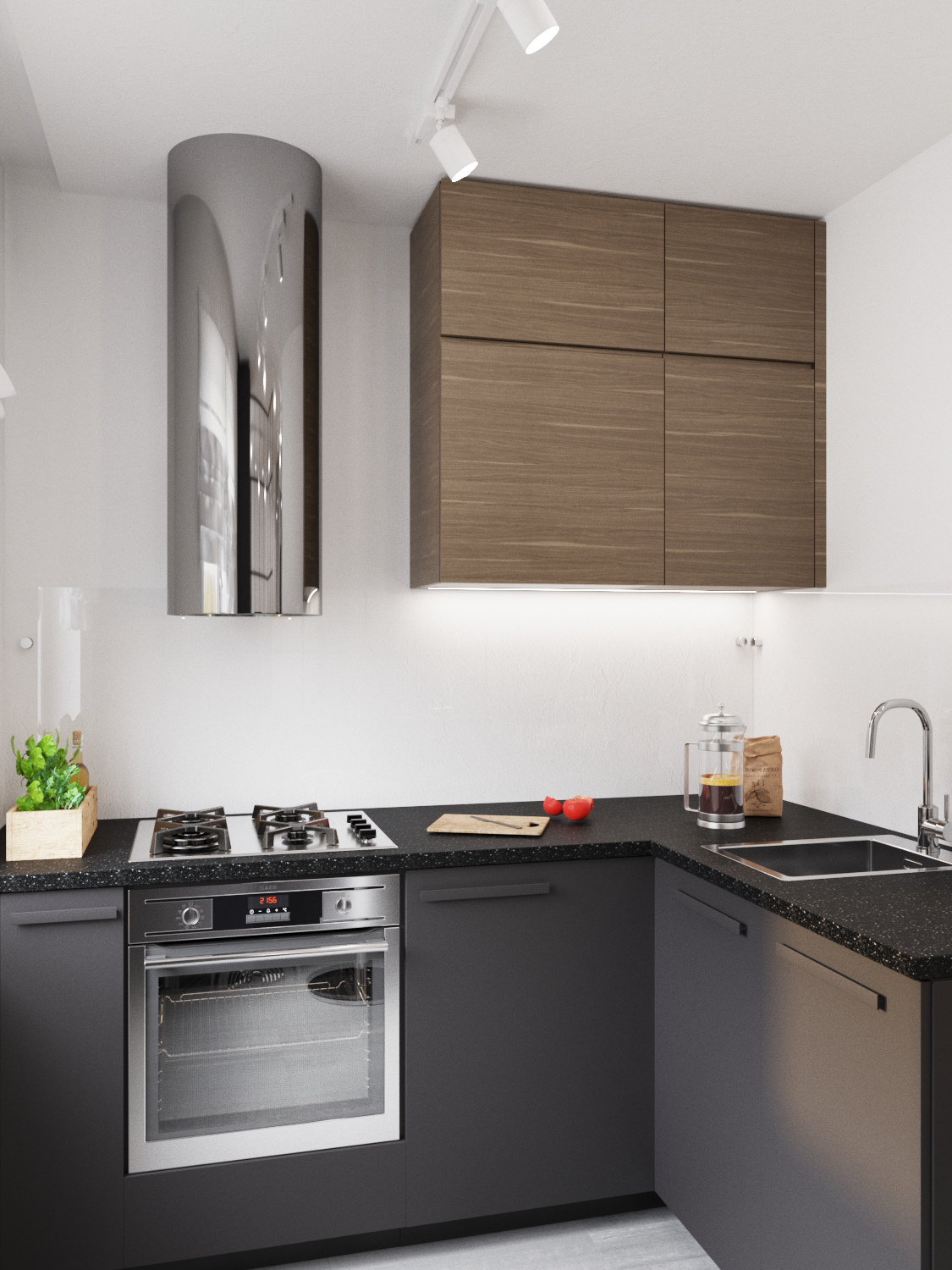 - негромоздкая техника: варочная панель на 2 конфорки, а не на 4, СВЧ, совмещённая с духовым шкафом, узкие посудомойка и холодильник;