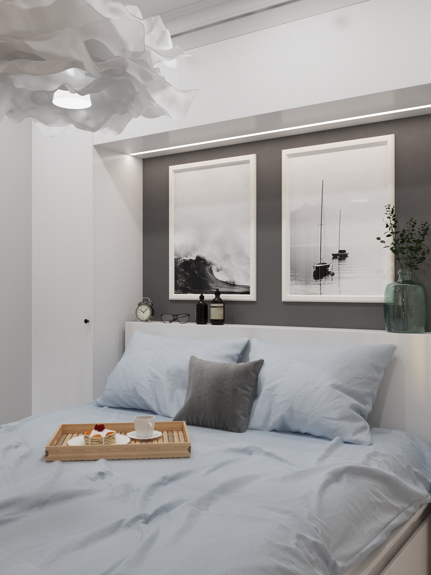 Общая концепция интерьера. Светлые оттенки или белый цвет делают квартиру визуально просторнее. Тёмные цвета при этом используются только в качестве акцентов для придания геометрии и глубины пространству. Например, тёмно-серая стена над изголовьем кровати перекликается с серыми шторами у окна напротив. Ещё одно правило — чередование оформленных декором стен с пустыми промежутками, чтобы не возникало ощущения захламлённости.