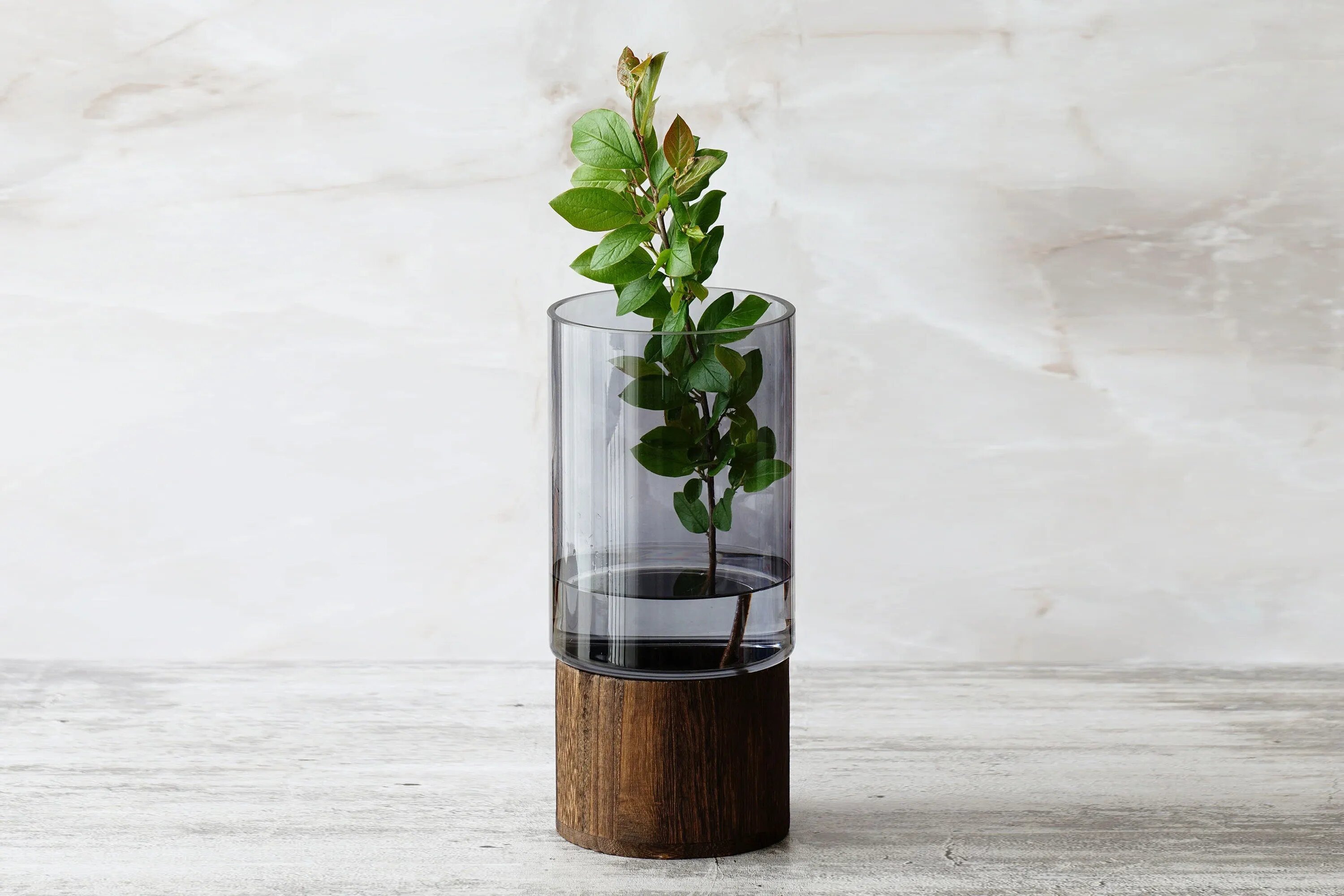 Интерьерные вазы из стекла со съёмным деревянным основанием впишутся почти в любой стиль — от скандинавского минимализма до грубоватого лофта. Такую вазу можно заполнить не только цветами, но и камушками, гидрогелевыми шариками, огнями гирлянд, а можно и просто поставить внутрь ароматическую свечу. Это универсальное решение, которое может стать отличным подарком.