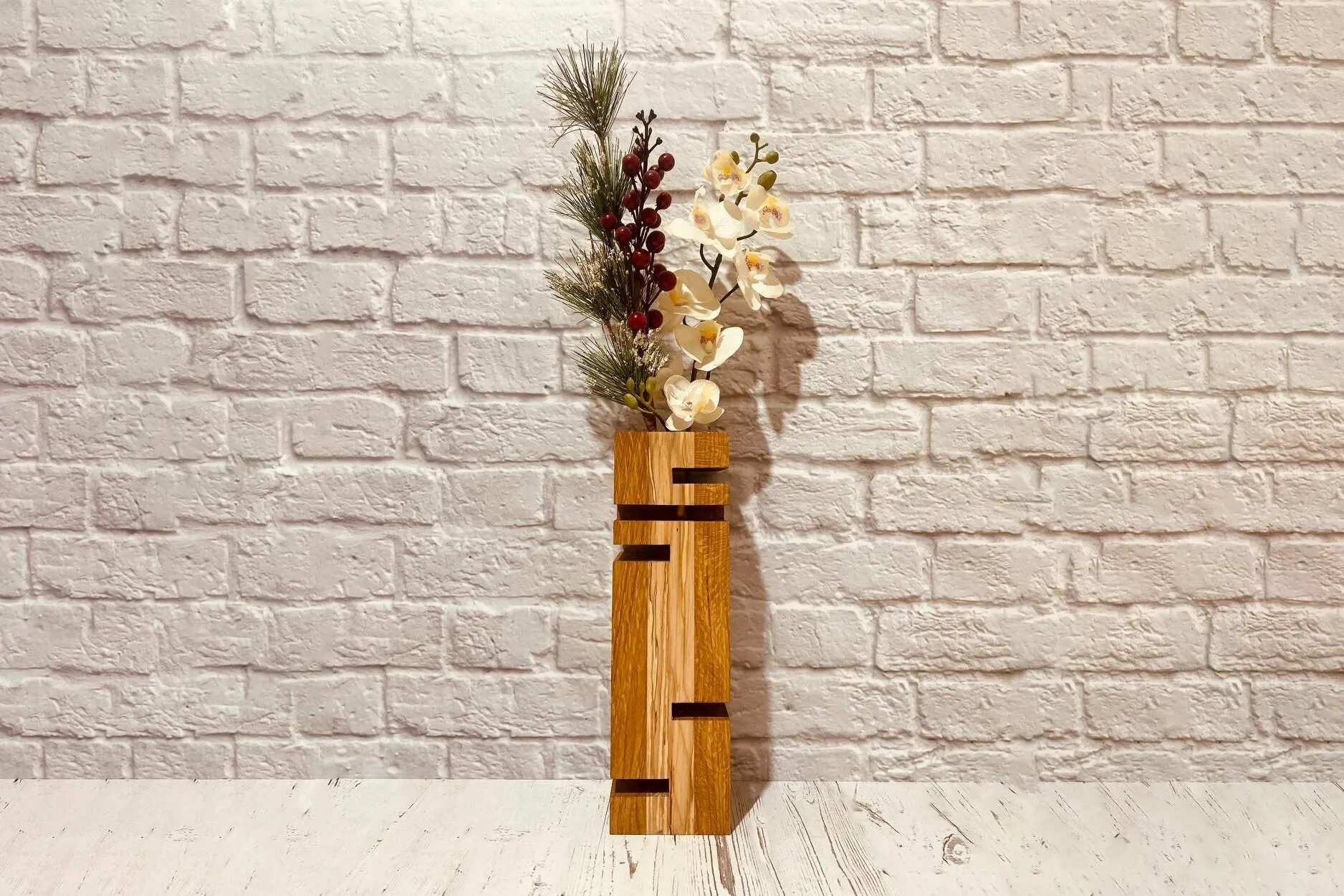Декоративная ваза из дуба и берёзы не только красива, но и долговечна: обработанный материал прослужит много лет даже при регулярном использовании. Уникальный дизайн делает вазу универсальным элементом интерьера: когда нет цветочных букетов, её можно использовать как декоративную подставку для книг.