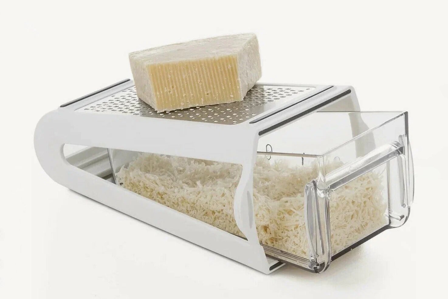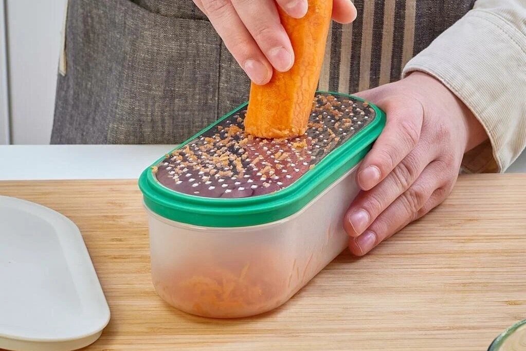 - С контейнером, который позволяет легко пересыпать подготовленный продукт. Его также можно использовать и в качестве ёмкости для хранения натёртого в холодильнике.