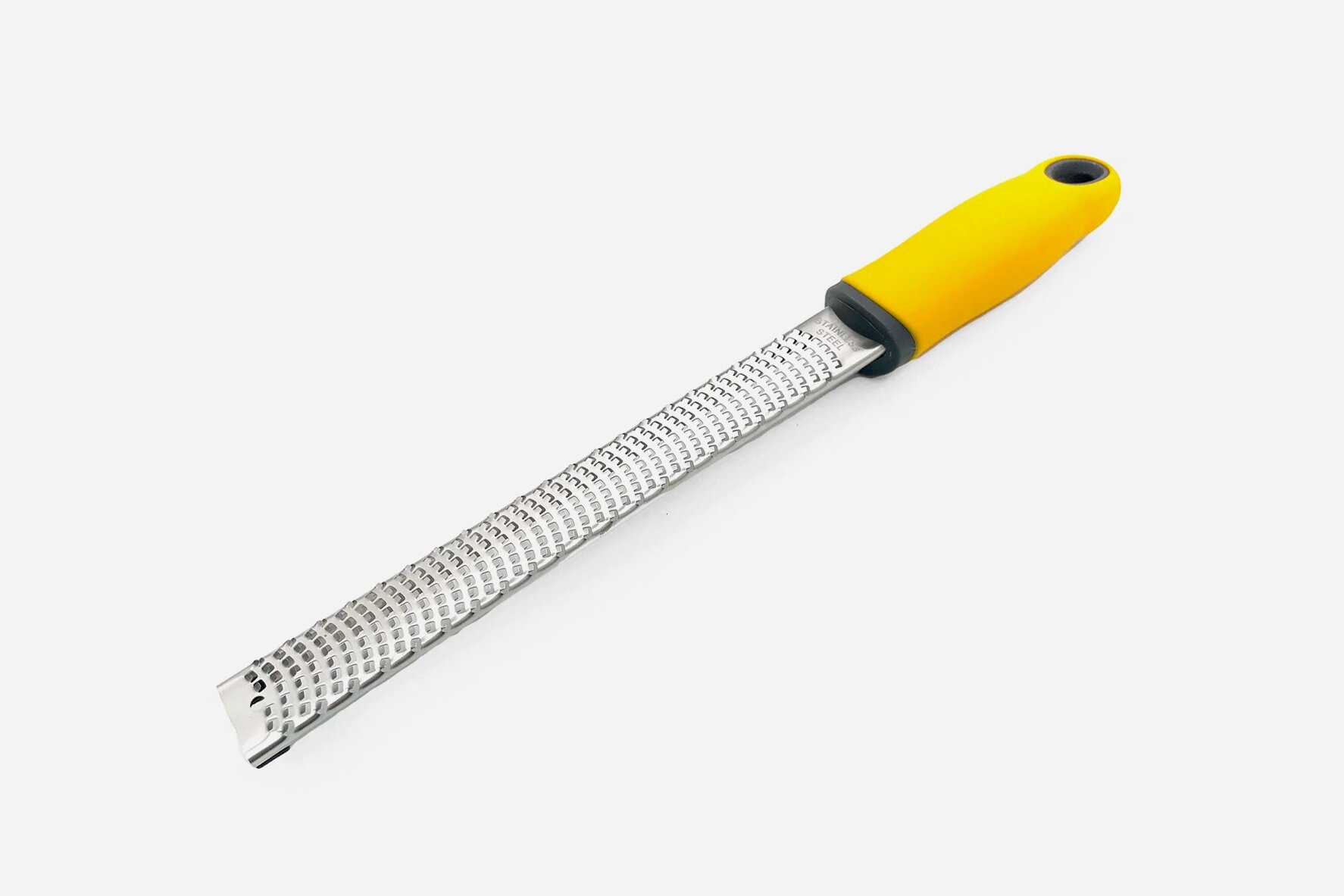 - Плоская тёрка с длинной ручкой простая в уходе и компактная — её можно повесить на крючок или положить в ящик со столовыми приборами. Она почти не займёт места на кухне, но хуже справляется с твёрдыми продуктами из-за слабой конструкции. К тому же у такой тёрки всего одна рабочая поверхность, что сильно сокращает её возможности — она подойдёт для быстрого эпизодического натирания, например зубчика чеснока или сыра прямо в порционную тарелку.