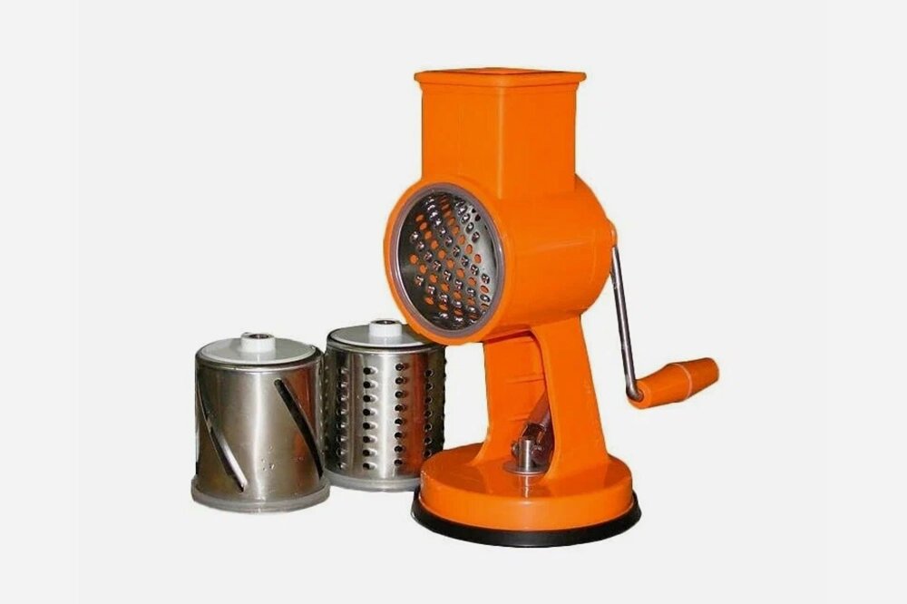 - Механические тёрки. Внешне этот инструмент напоминает советскую мясорубку и работает по тому же принципу: надо вращать ручку, чтобы лезвие двигалось и измельчало продукты. В комплекте несколько насадок для разного типа нарезки. Приспособление универсальное и удобное, но его придётся каждый раз собирать и разбирать. Если надо натереть пару зубчиков чеснока или одну морковку, это не слишком рационально.