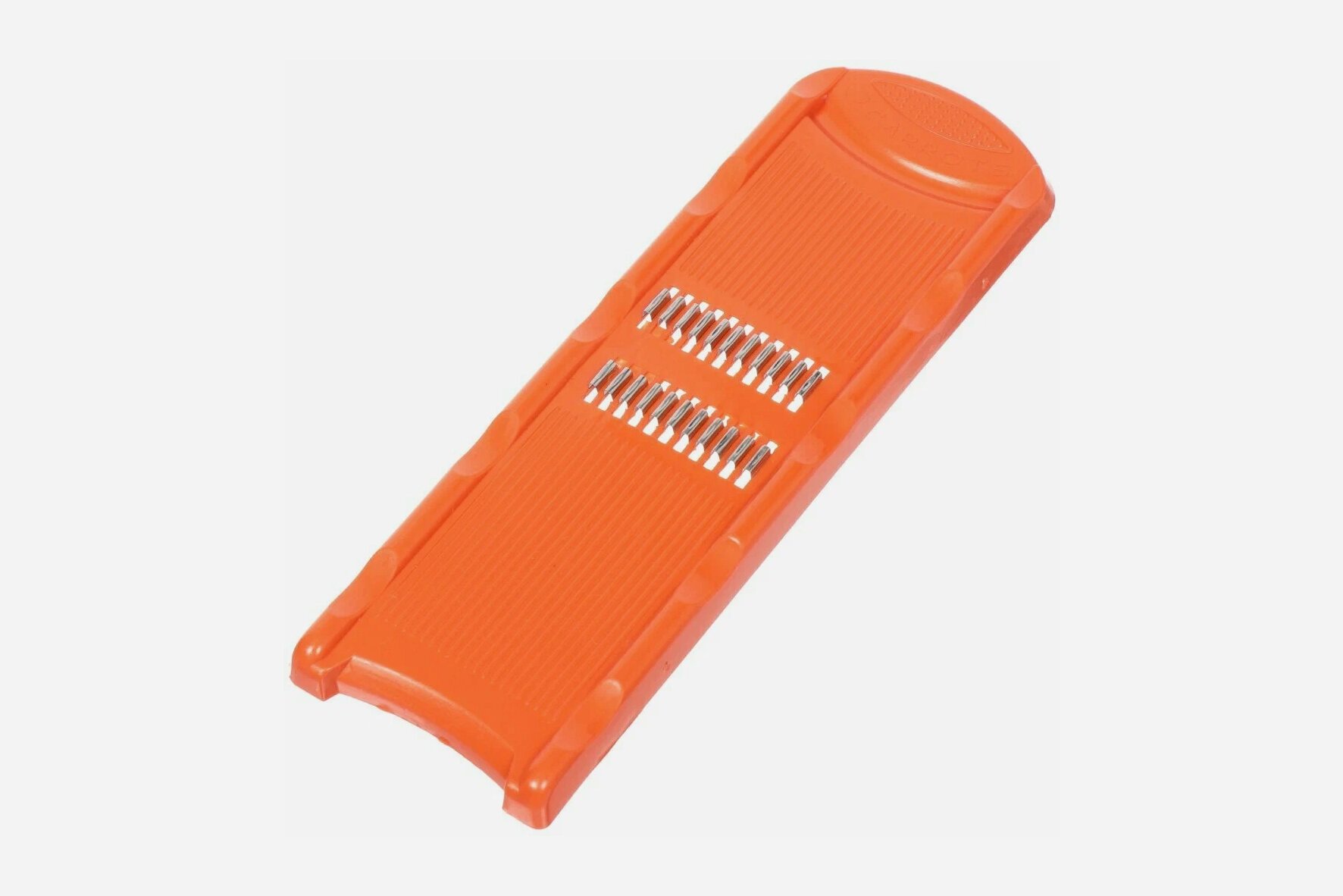 - Плоская тёрка со сменными лезвиями позволяет нарезать продукты разными способами: слайсами, стружкой, соломкой (в зависимости от типа насадок в комплекте). Опционально она может быть оснащена контейнером и дуршлагом, а также держателем для фиксации продукта и безопасного натирания.