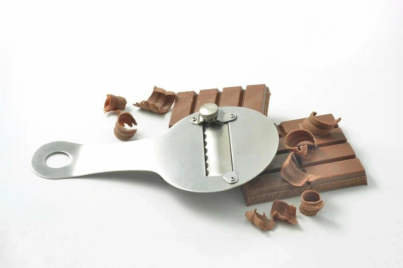 Получить красивую равномерную шоколадную стружку, ровные слайсы и завитки для декорирования кондитерских изделий и мороженого помогает специальная тёрка с широкими отверстиями и функцией регулировки толщины нарезки.
