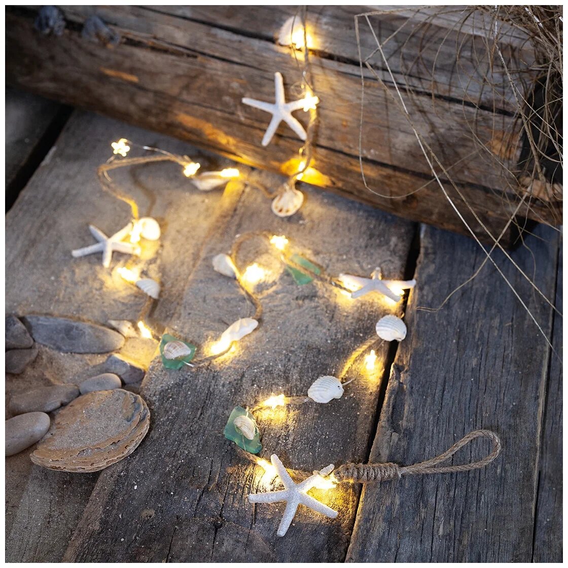 Всё, что нужно для атмосферы Карибов: морские звёзды, ракушки, камешки и, конечно, нить крошечных лампочек, переплетённая с грубоватым шнуром из растительного волокна. Подойдёт всем, кто давно не был в отпуске или решил под пину-коладу пересмотреть с друзьями все части «Пиратов Карибского моря».