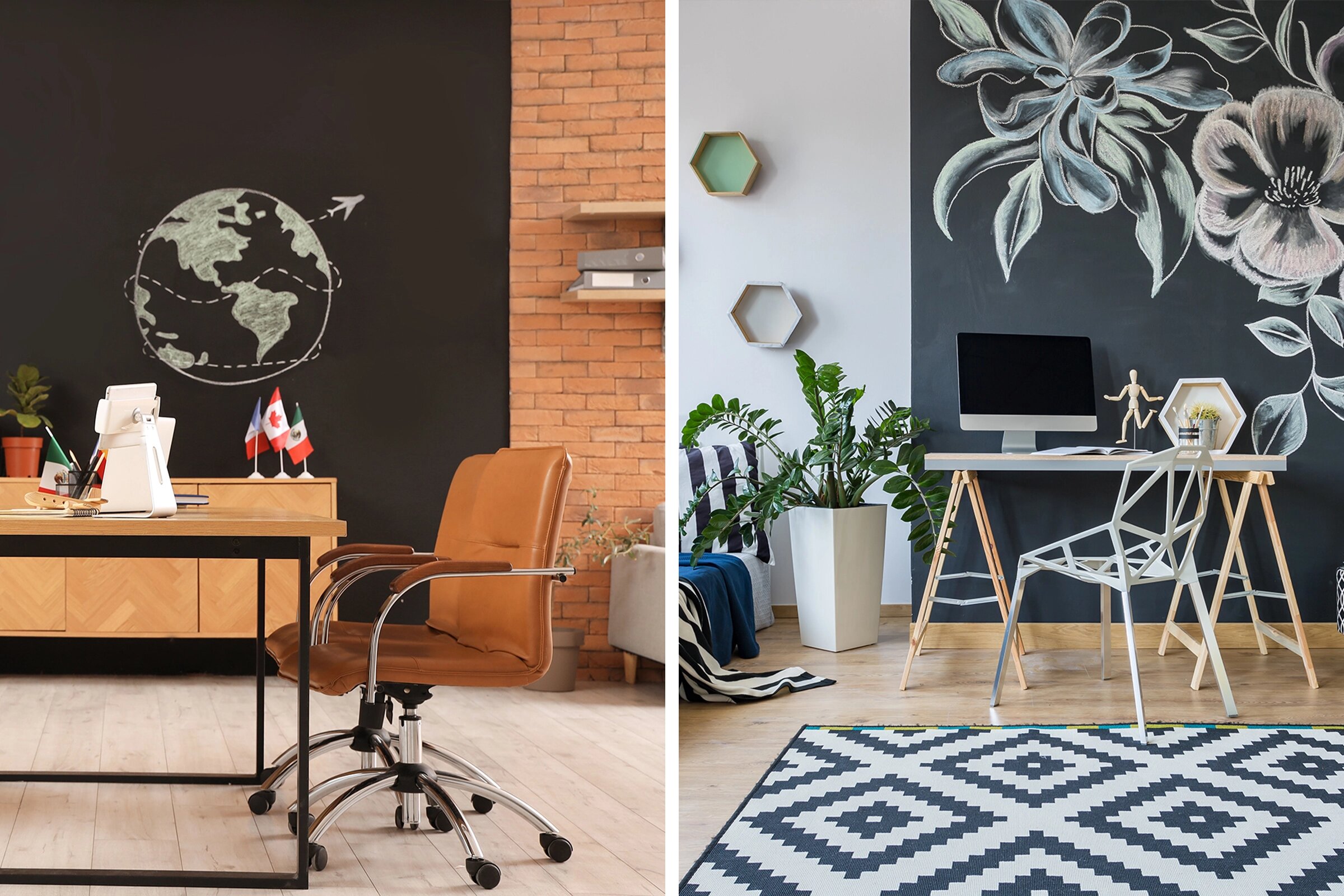 - В кабинете на грифельной доске можно составить расписание встреч и задач, записать важный телефонный номер. Именно в рабочих зонах тёмный цвет акцентной стены (а грифельные покрытия, как правило, тёмные) особенно уместен: он создаёт ощущение строгости и порядка.