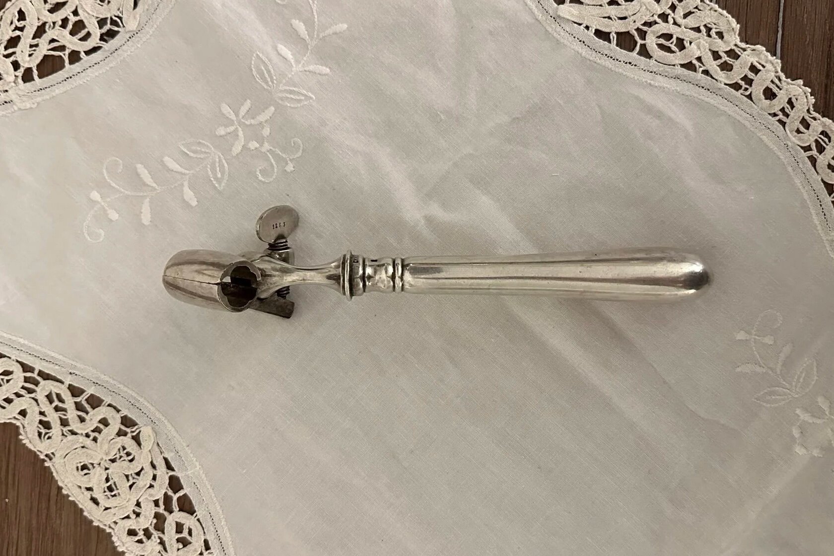 Этот элегантный зажим — специальный держатель для бараньей ножки или окорока. Его придумали кулинары, чтобы мясо было удобно нарезать прямо за столом. Сегодня он выглядит как эффектный винтажный аксессуар, но когда-то был вполне практичной частью сервировки.