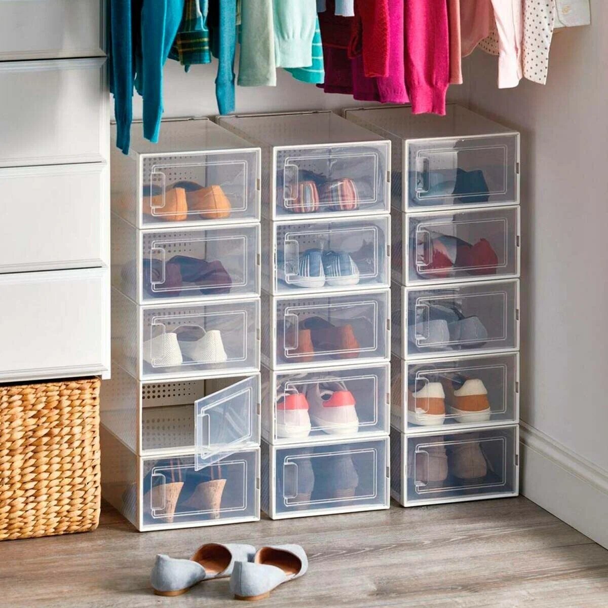Прозрачные коробки для обуви. Большинство людей хранит обувь в картонных магазинных упаковках. Это дёшево, но найти быстро нужное иногда сложно. Лучше использовать коробки, в которых сразу видно, что и где лежит.