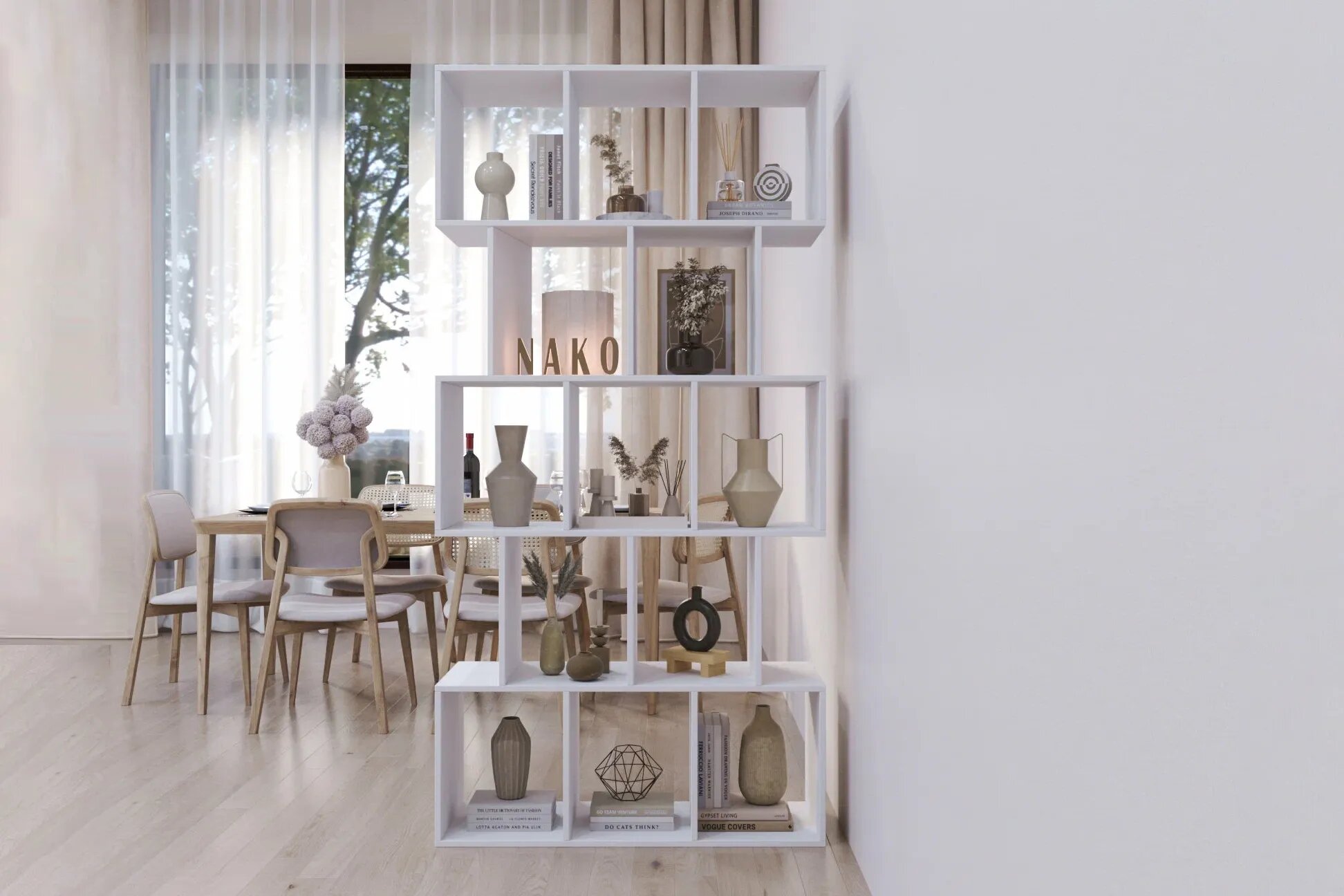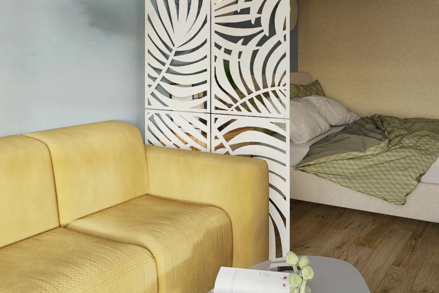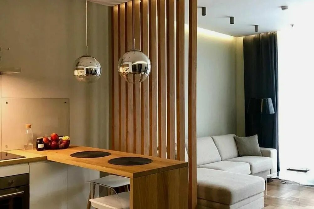 Если квадратура позволяет, ширму можно заменить на стеллаж, выполняющий функцию перегородки. Вместе с этим он станет ещё одним местом хранения маленьких безделушек и книг, чем заметно разгрузит другое полезное пространство комнаты.
