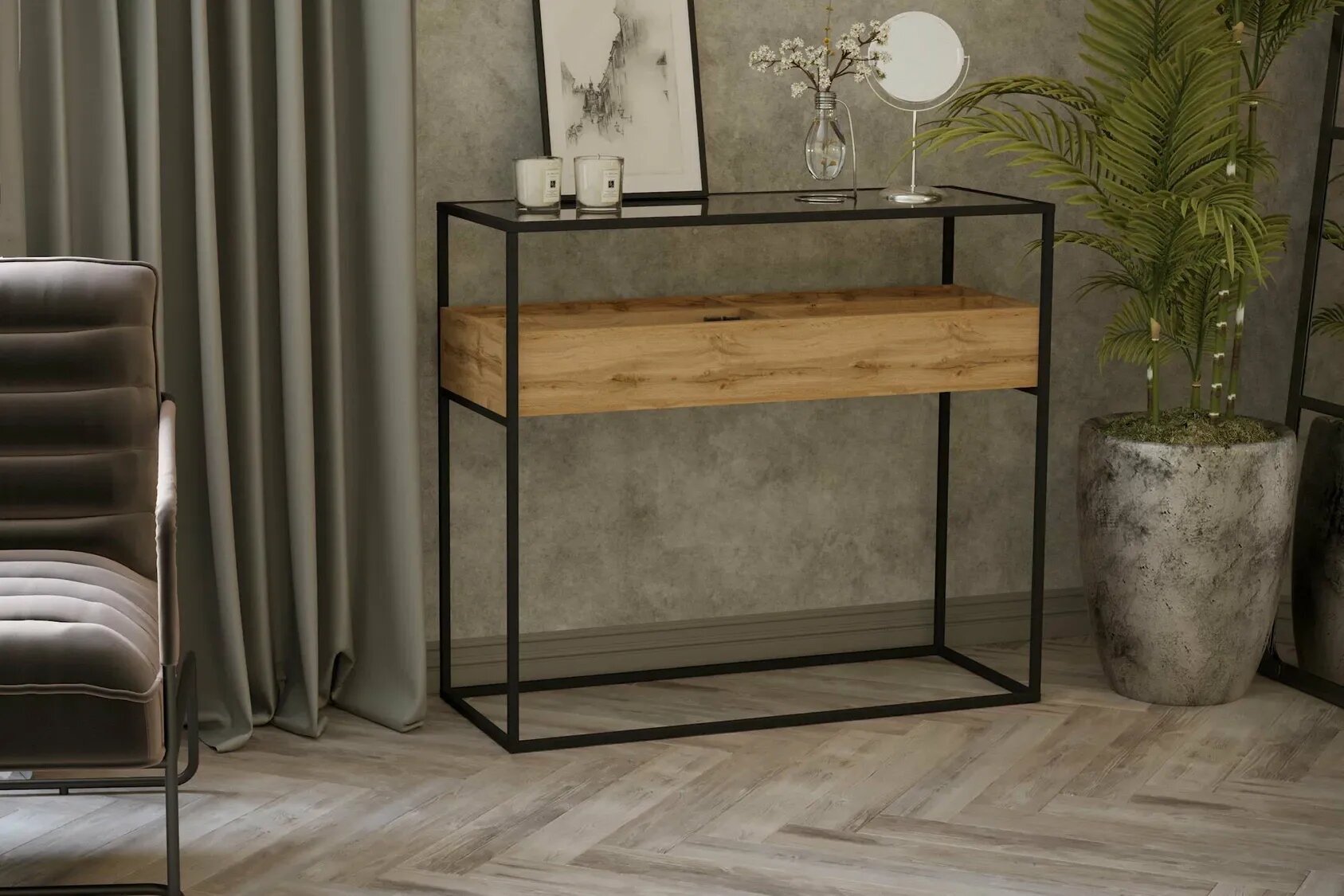 Рядом с вешалкой хорошо бы поставить небольшой столик, на который будут «падать» все пакеты, сумки и мелочи — по аналогии с консолью в прихожей.