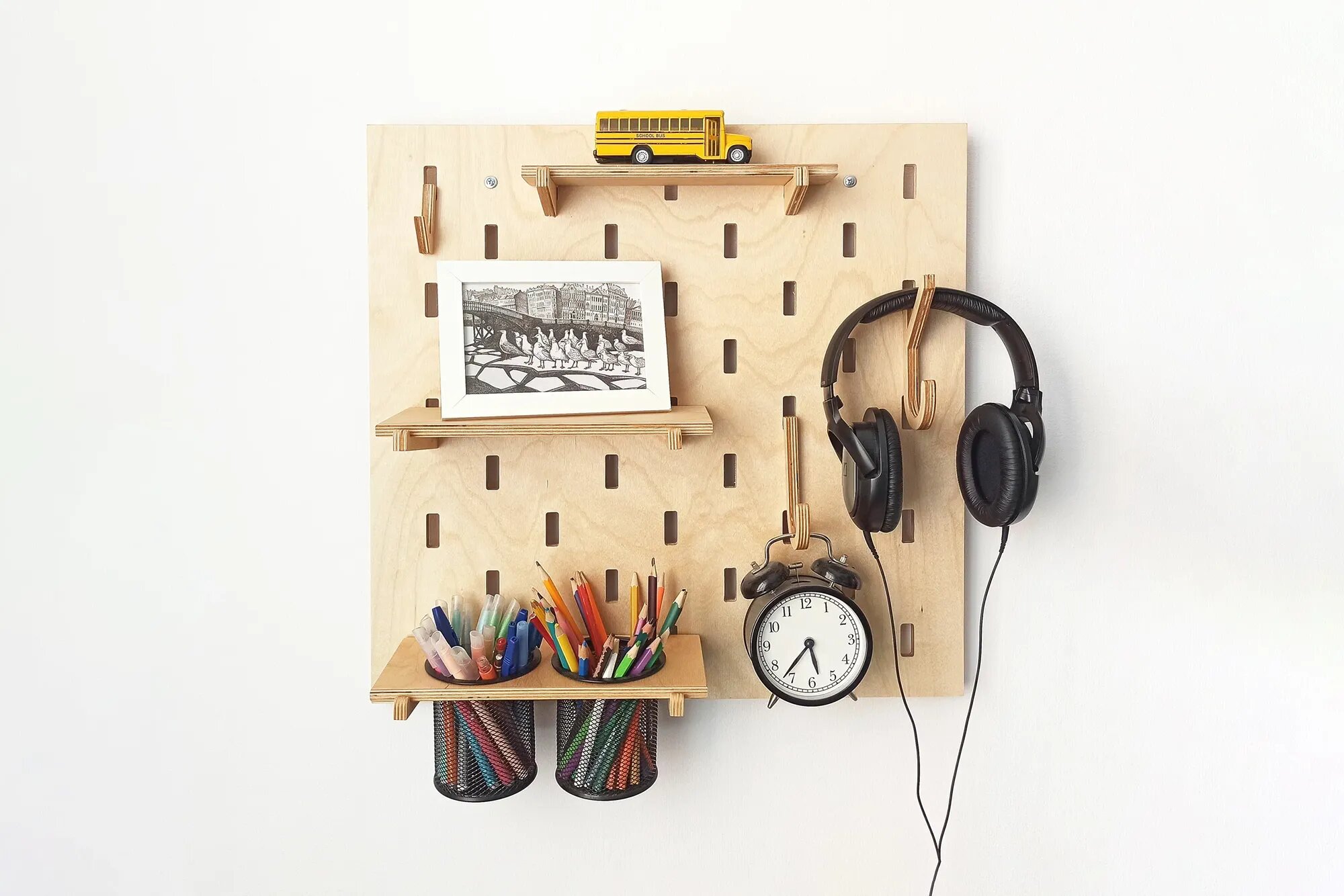 Разгрузить рабочий стол — значит практически наполовину завершить уборку в комнате ребёнка. Помочь в этом может пегборд — специальная перфорированная доска, на которую крепятся органайзеры, полки, а «на сдачу» — фотокарточки и рисунки.