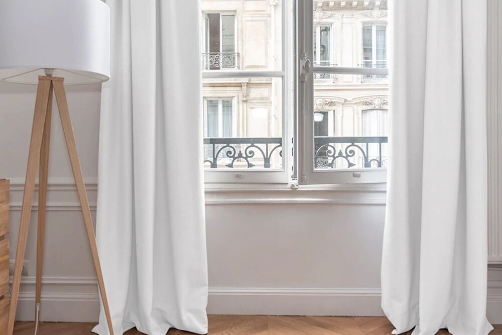 - Повесить особенные занавески на окна. Даже обычные шторы-блэкаут из рогожки блокируют около 20–30% посторонних шумов с улицы. Ещё лучше с задачей справляются специальные шумопоглощающие шторы из плотного и тяжёлого материала. Они задерживают до 70% назойливых звуков извне. Совет: делайте шторы волнистыми: чем больше складок, тем лучше защита от шума за окном.