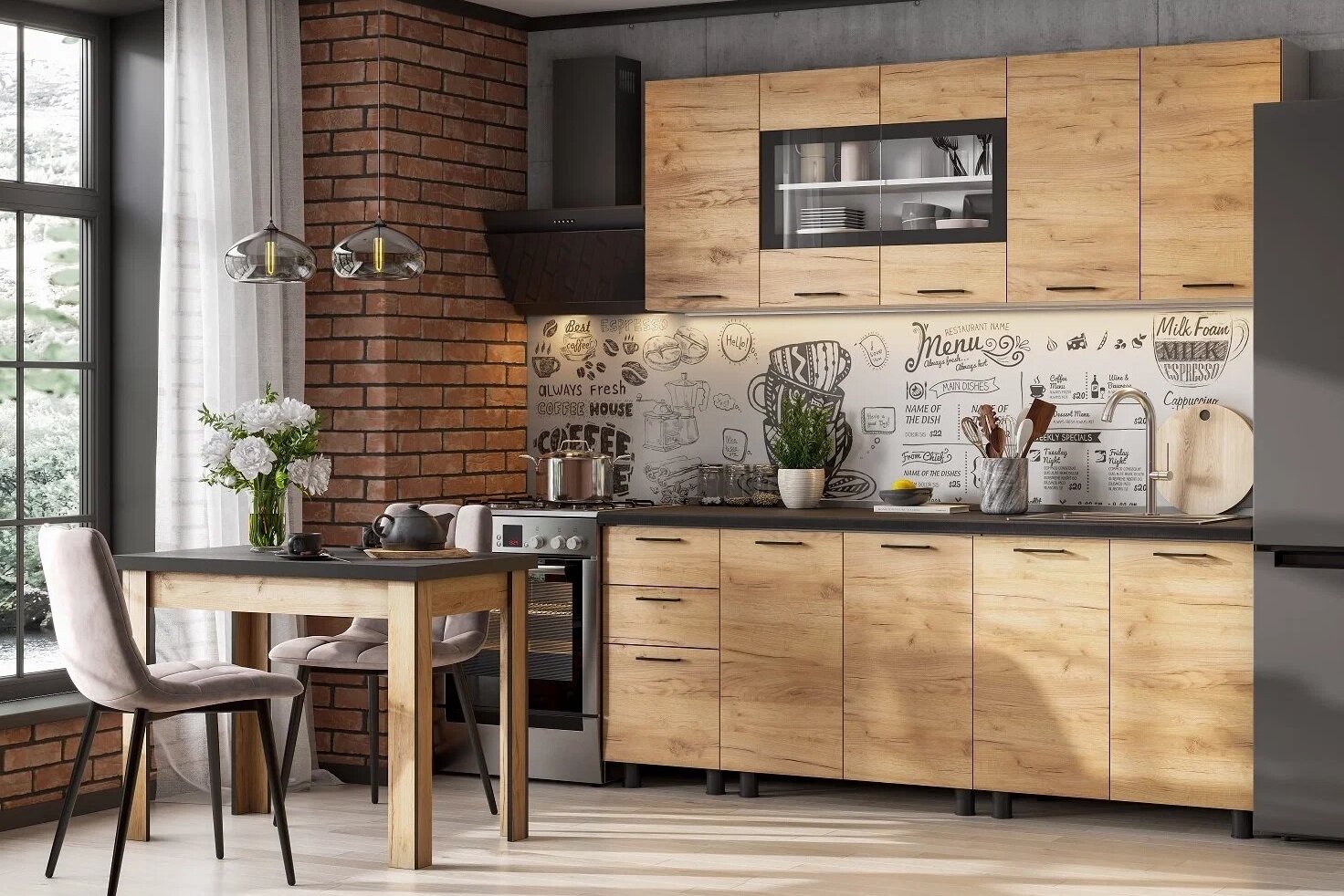 Как противовес, на кухне хорошо будут смотреться тёмные фасады (но не обязательно), и в этом случае придётся «поиграть» со светлыми аксессуарами. В стиле бунгало столовая комната отсутствует, но на территории кухни выделяется зона для обеденного стола.