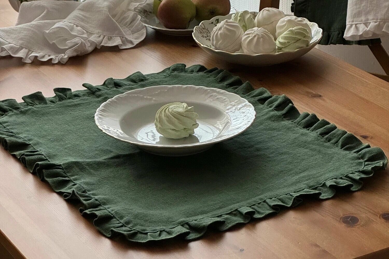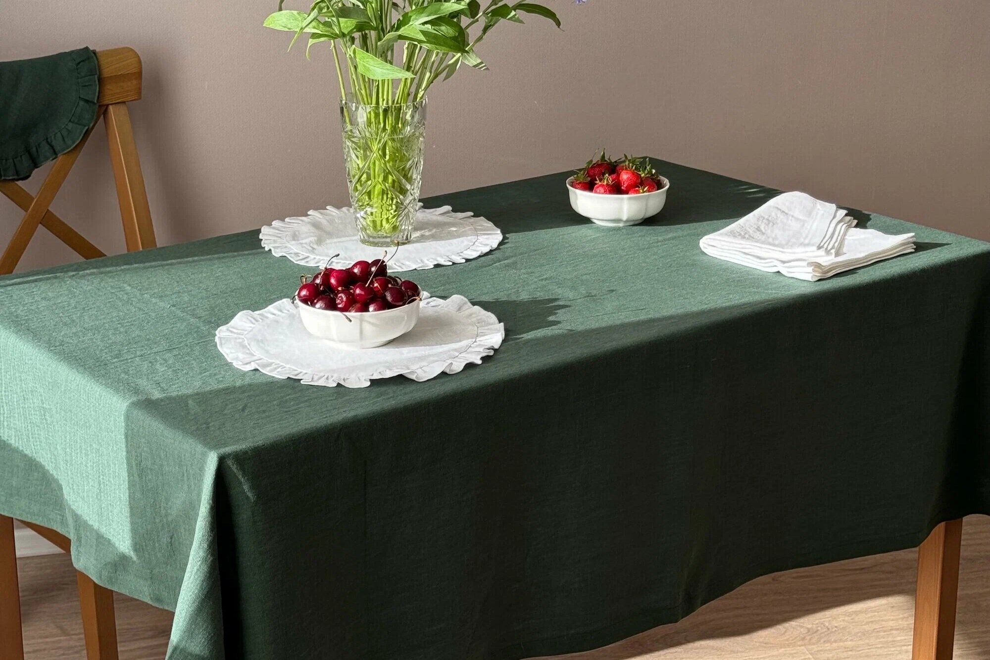 Орнаменты. Несмотря на то, что стилю присуща однотонность, всё же допустимо использование вышивки с национальным колоритом и флористических мотивов и даже гобеленов. Кухню можно украсить глиняной посудой, плетёными лотками для овощей, льняными скатертями и салфетками.