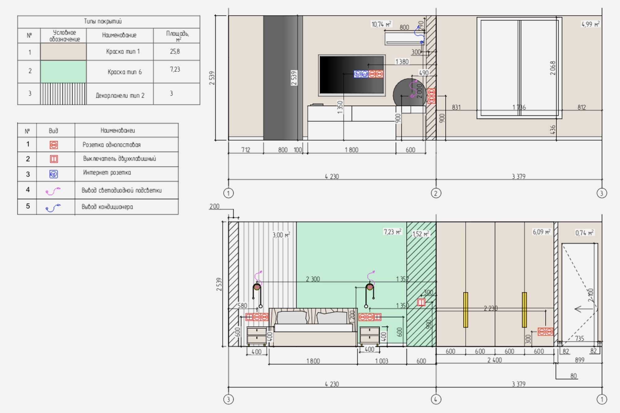 Я всегда начинаю с расстановки мебели. В типовой спальне почти всегда есть кровать с тумбами по обе стороны, шкаф, телевизор и иногда туалетный столик. Исходя из этого, схема розеток получается довольно понятной.