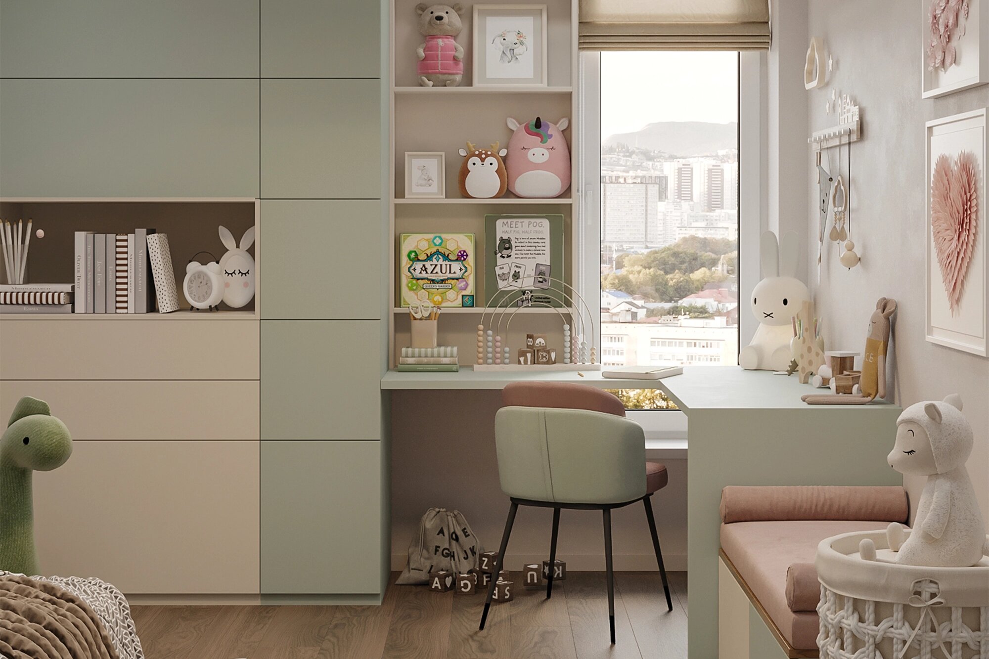 Это особенно важно в квартирах, где детская изначально небольшая и нет запаса для свободной перестановки мебели. Когда ребёнок подрастает, рабочее место появляется почти неизбежно, и оно должно быть удобно подключено без дополнительных решений.
