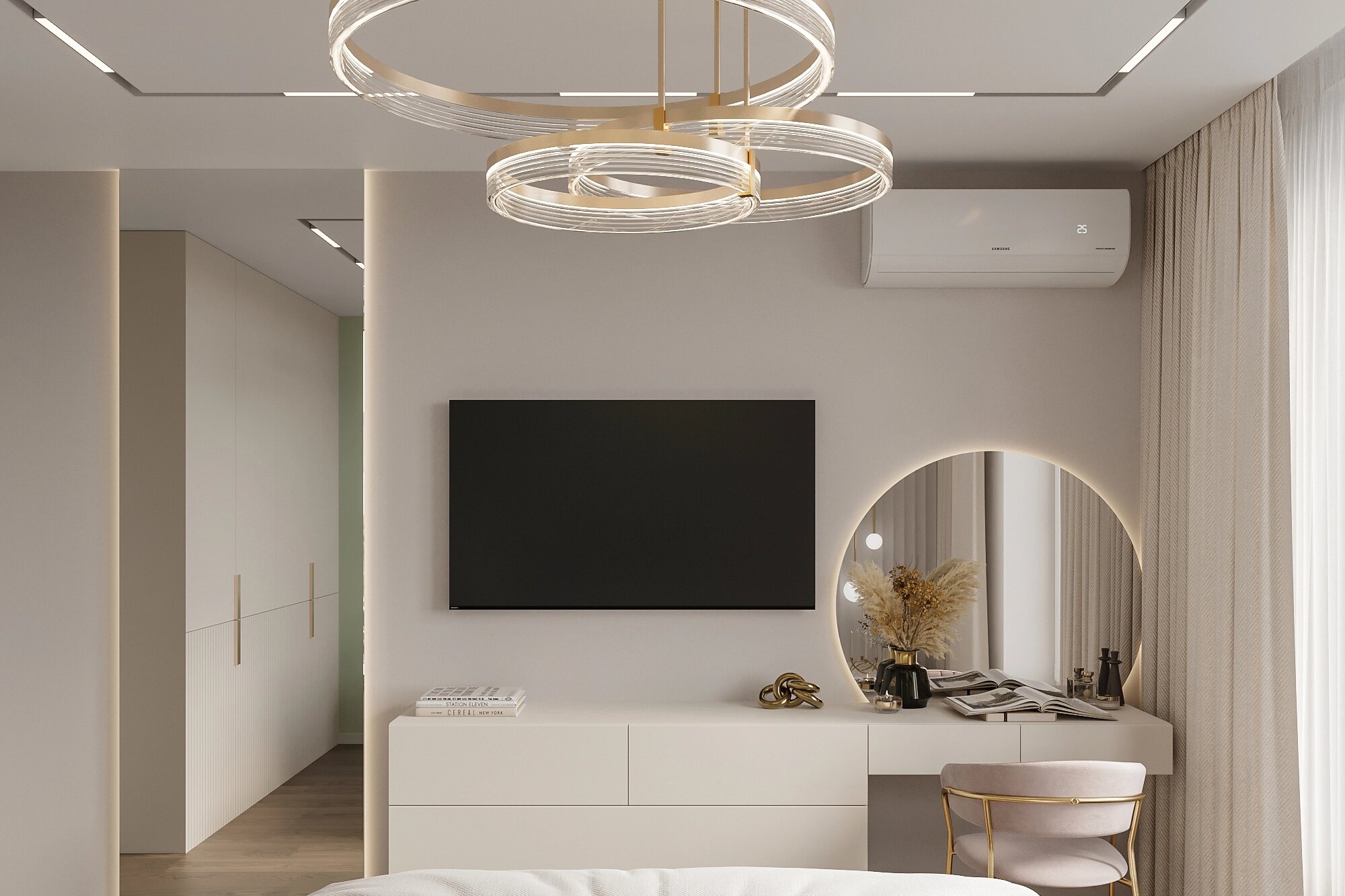 Если в спальне предусмотрен туалетный столик, рядом с ним обязательно появляются розетки под фен и другие приборы. И да, я часто добавляю отдельную декоративную розетку — под гирлянду или мягкий ночной свет. Это мелочь, но именно она делает пространство более удобным.