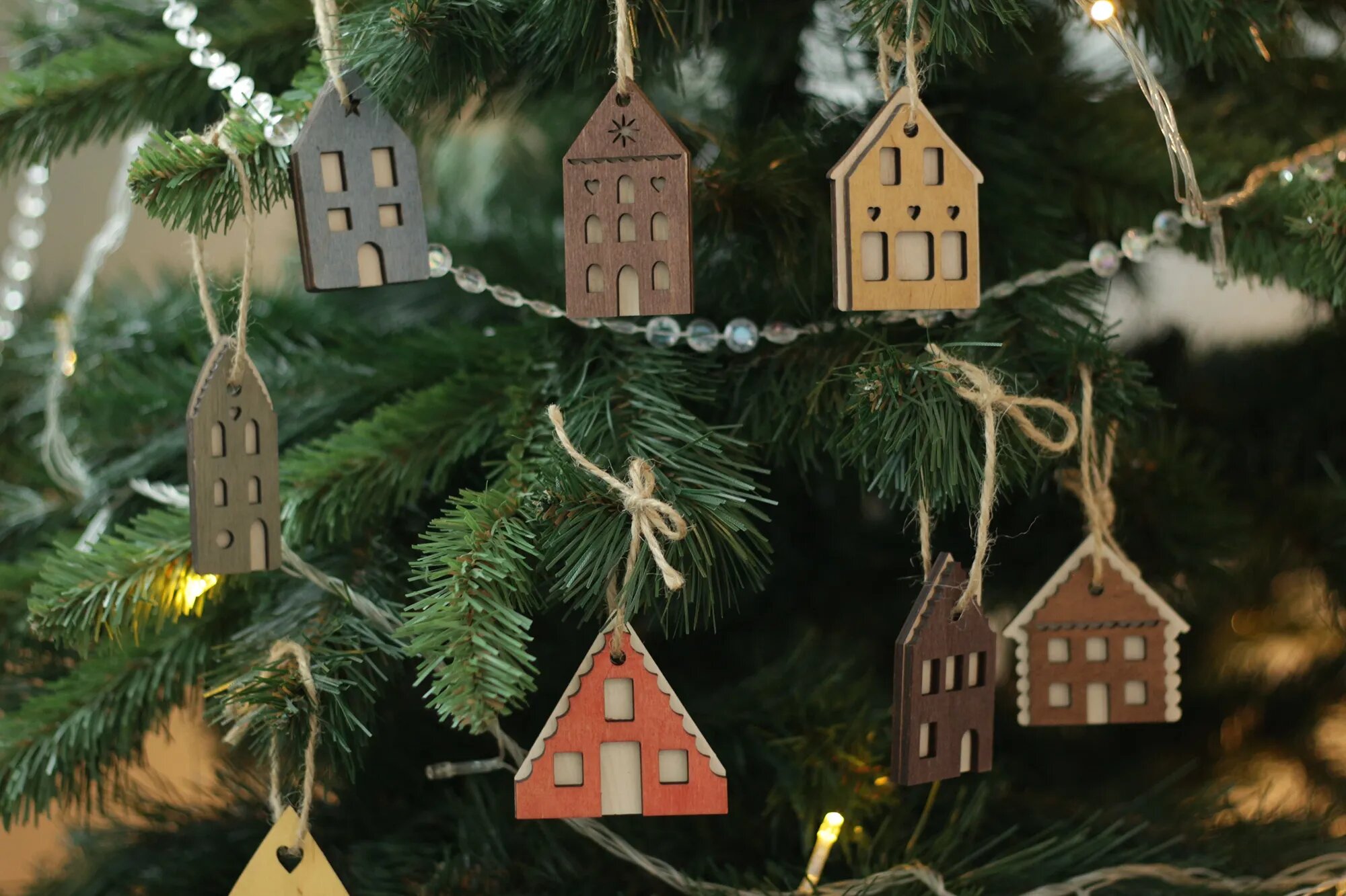 Тщательно закрепить придётся и ёлочные игрушки. Помимо заводского крепления, можно дополнительно зафиксировать декор на ветке джутовой ниткой.