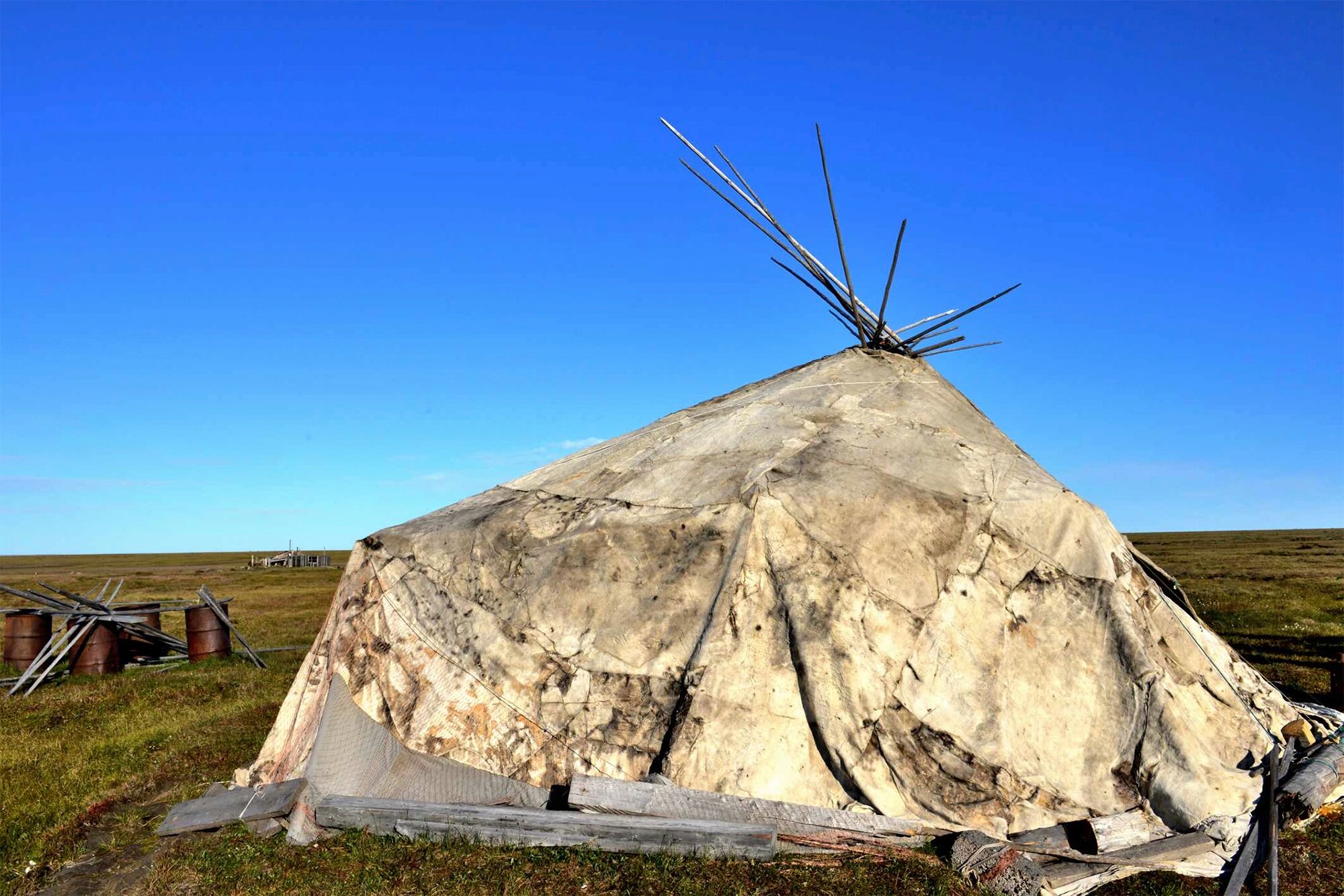Чум. Мобильное жилище кочевников. Ненцы, эвенки, ханты собирали конический шалаш: брали жерди, соединяли их сверху и на лето покрывали берестой или замшей из оленьей кожи. На зиму чум утепляли уже двумя слоями оленьих шкур.