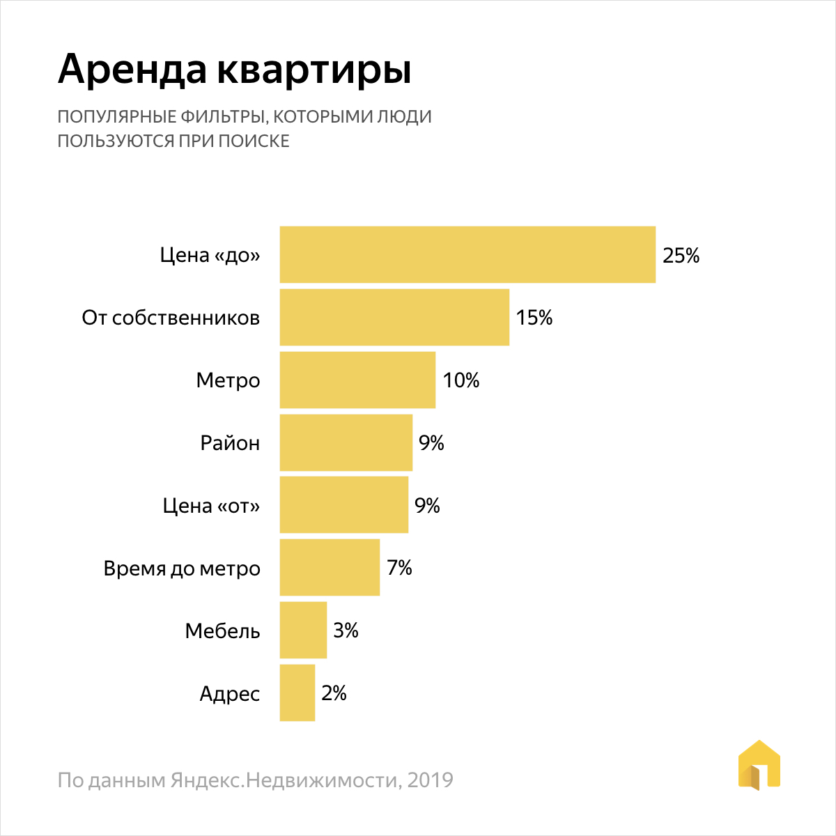 Основной параметр поиска съёмных квартир — цена. Этот фильтр используют около 25% пользователей. 15% ищут предложение от собственников. По сути, это тоже финансовый фильтр, ведь он означает, что люди не хотят платить комиссию агенту, а намерены арендовать жильё напрямую.