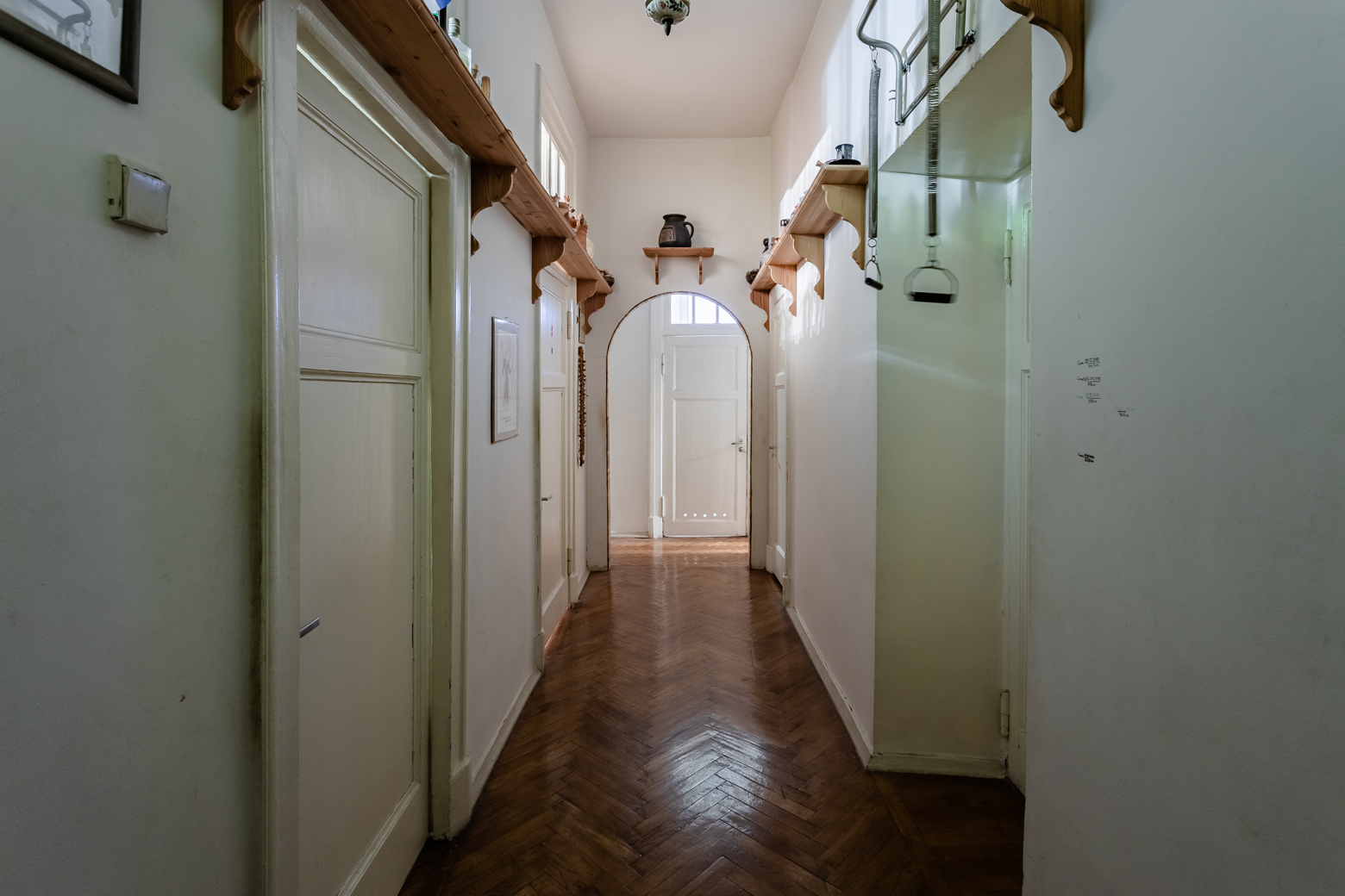 Многие детали квартиры хорошо сохранились благодаря нанесённым предыдущими жильцами слоям масляной краски. Нам достались межкомнатные двери со световыми окнами, паркет, гипсовая лепнина на потолке и оригинальные элементы хранения — уличный шкаф на кухне, две кладовые и дополнительная кладовая около чёрного хода. Осталось даже окно для передачи продуктов на кухню из подъезда. Сам оконный проём заложен, но ниша сохранилась и сейчас используется как шкаф.