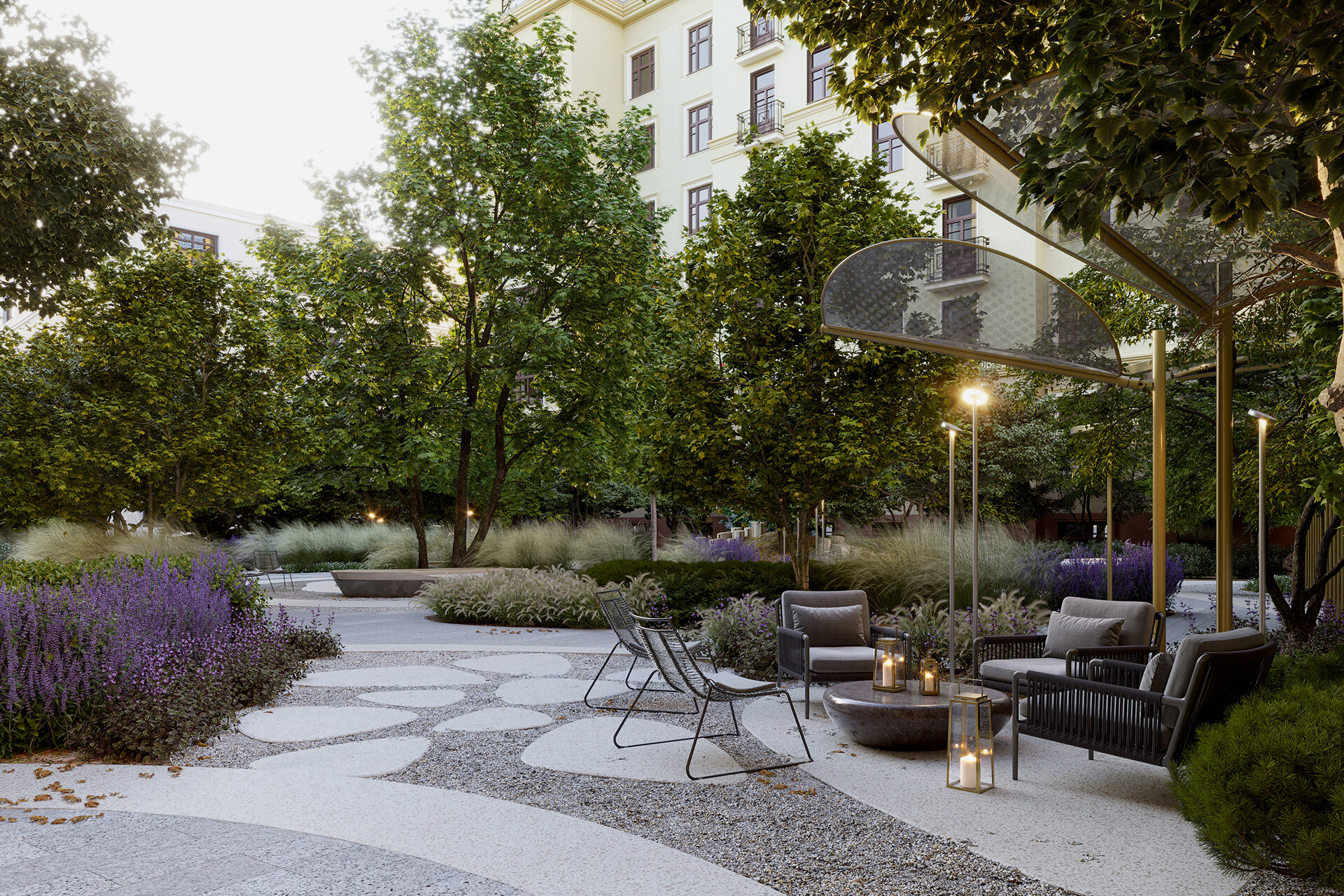 Территория разбита на три двора с разным стилем и настроением. На общественной площади будет декоративный фонтан, перголы и ресторан. В приватных дворах оборудуют водоёмы, зоны релаксации, игровые и спортивные площадки. Собственная инфраструктура включает подземный паркинг с автомойкой, коворкинг, пространство для мероприятий, специализированную детскую зону, спа-комплекс с бассейном, зимний сад с камином, винный бар, чайную комнату, музыкальный лаунж, магазины и рестораны.