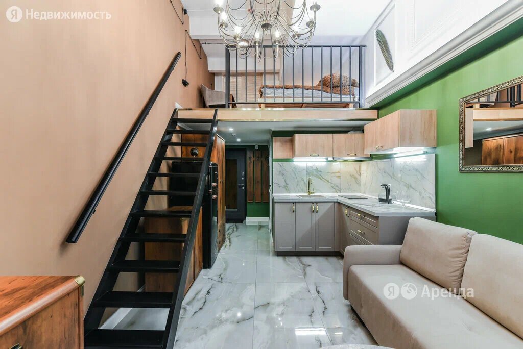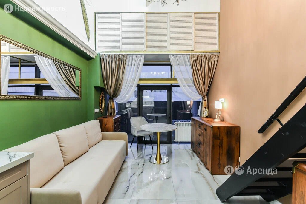Замечательным дополнением к отделке станут панорамные окна в пол и места для хранения вещей. На втором этаже располагается спальня и рабочее место. На первом — кухня-гостиная и совмещённый санузел. Верхнее пространство выполнено в светлых и коричневых оттенках, нижнее — в ярких цветах: зелёном и чёрно-белом. Важным «ура» будет тот факт, что студия находится на четвёртом, последнем этаже кирпичного дома, то есть никто не сможет прыгать у вас над головой в субботние 6 утра.