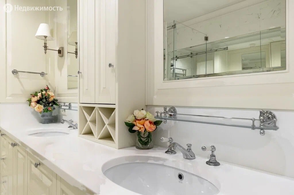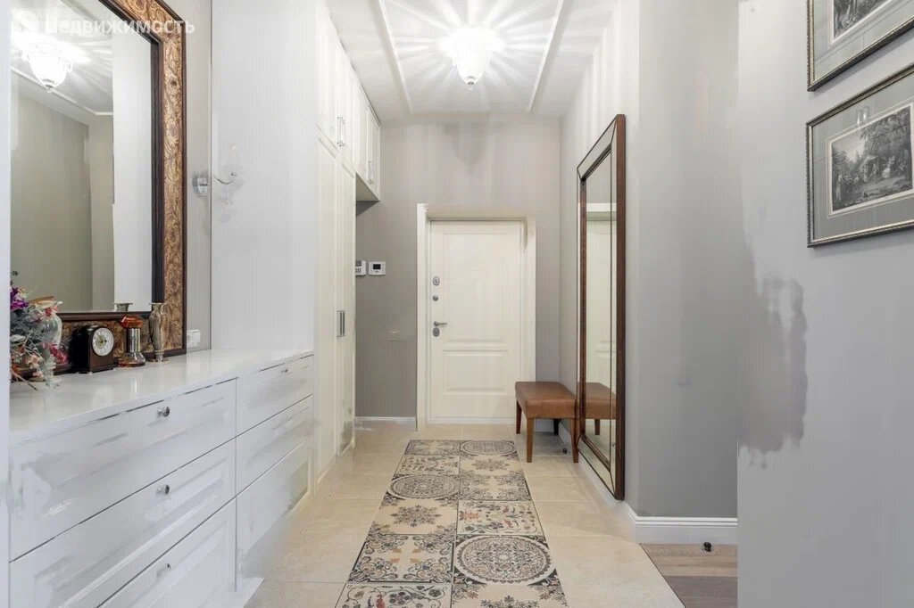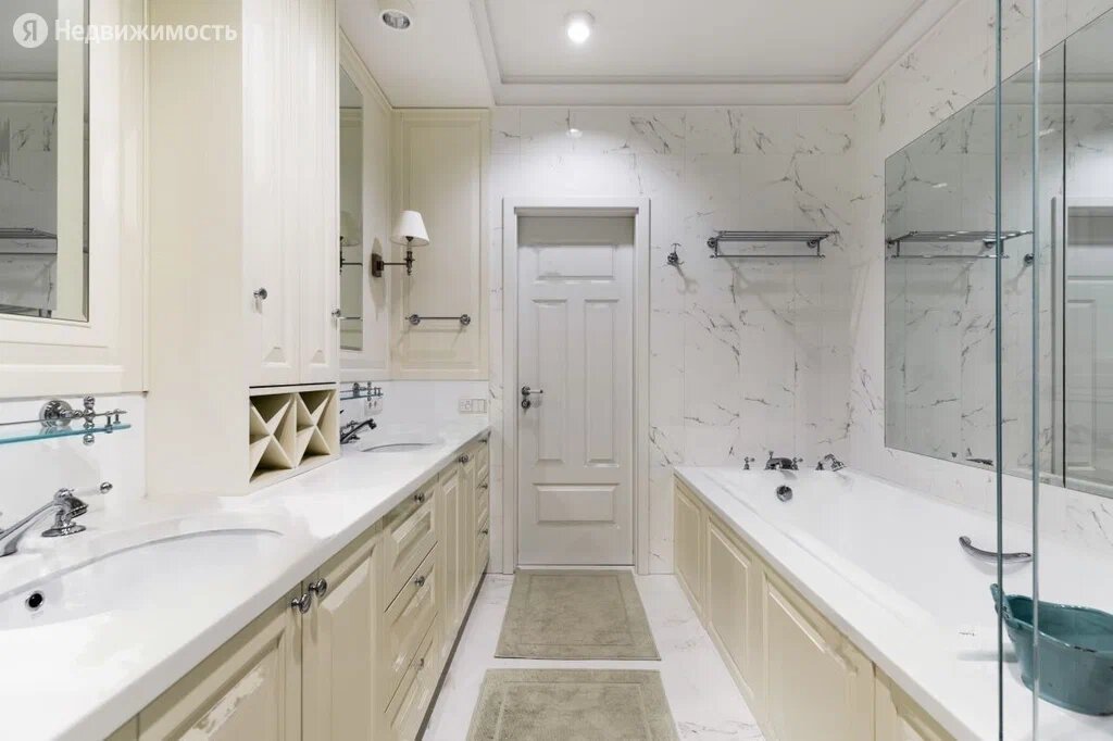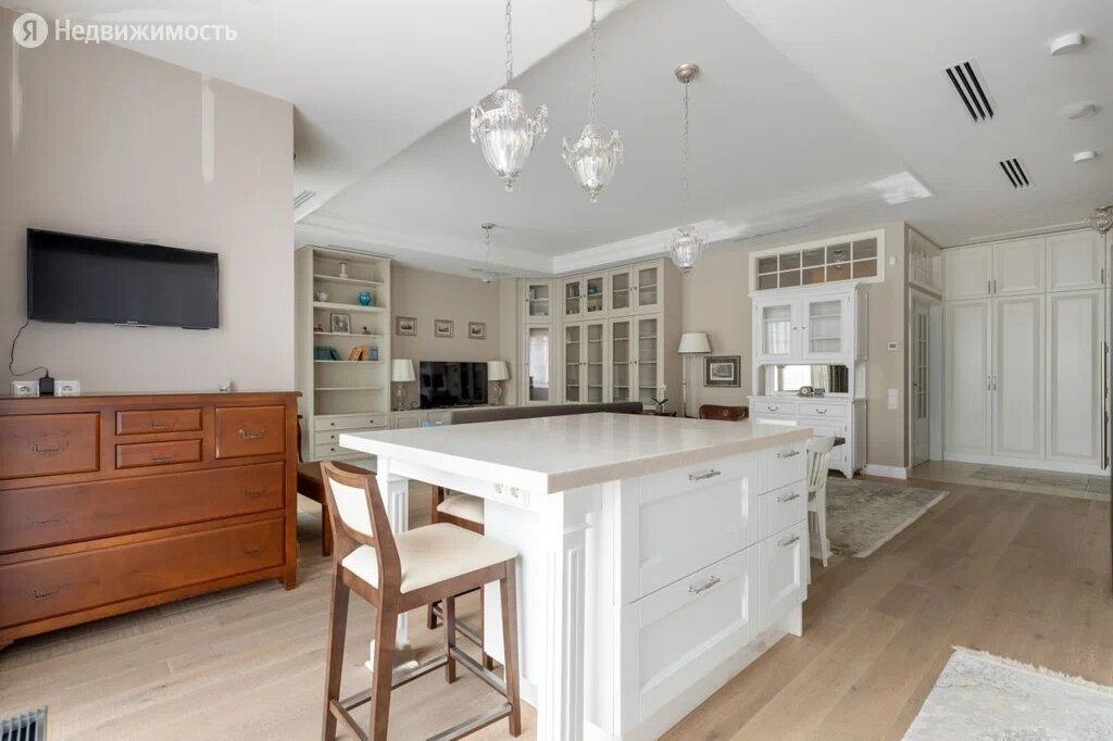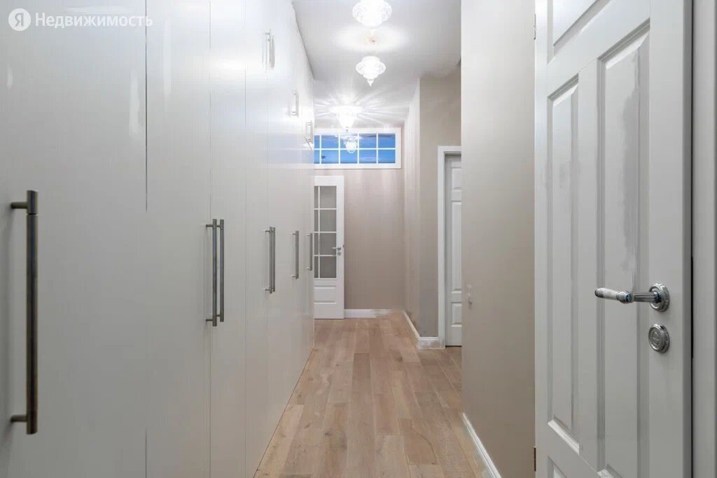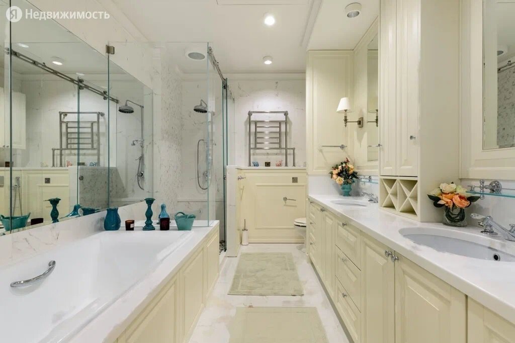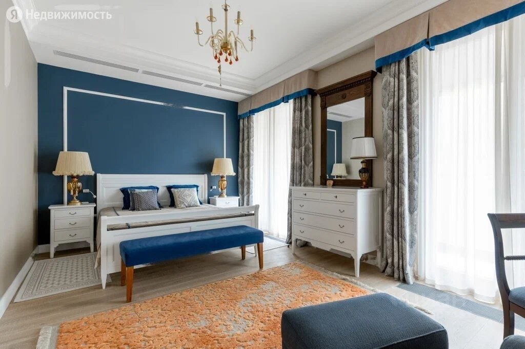 Квартира обустроена либо под большую семью, либо под человека, который очень (!) любит жить без ограничений. Об этом говорит множество систем хранения, вместительный кухонный гарнитур и отдельная комната-склад. Всё это великолепие выполнено в неоклассике, неброско и со вкусом. В отделке преобладают светлые и серые тона, выделяется только одна из спален, окрашенная на морской мотив в глубокий голубой цвет. Весь концепт дизайнерской мысли таков: больше, больше пространства для жизни! И потолки под 4 метра.