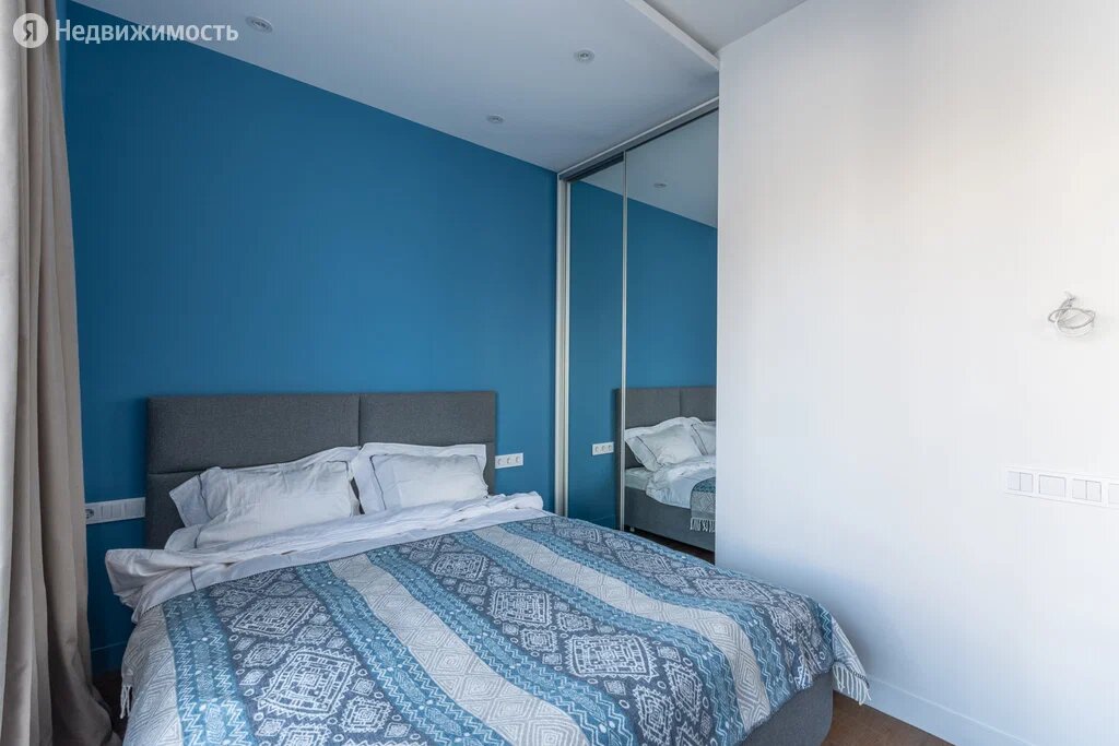 Для спокойного и крепкого сна в спальной зоне стоит мягкая (похоже, в этой квартире по-другому не бывает) двуспальная кровать. Над ней — встроенная подсветка, а напротив — большой и вместительный зеркальный шкаф. Стены выкрашены в глубокий синий цвет.