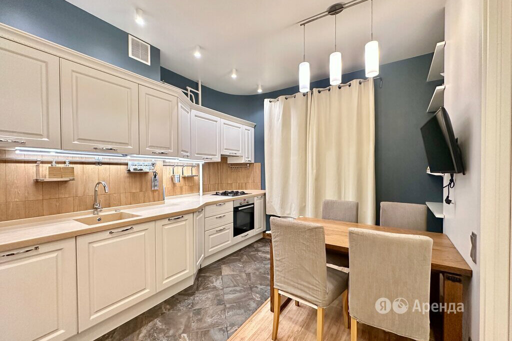 Вновь перемещаемся в трёхкомнатную квартиру. Площадь — 82 «квадрата», интерьер — по-домашнему уютный и семейный. Две изолированные спальни, есть одна проходная комната. Отделка светлая, но не блеклая: белый фон разбавляют элементы из дерева, красочный текстиль и цветовой акцент на стенах кухни. Находится квартира в 22 минутах езды от станции «Химки». Сколько же стоит аренда этого жилья?