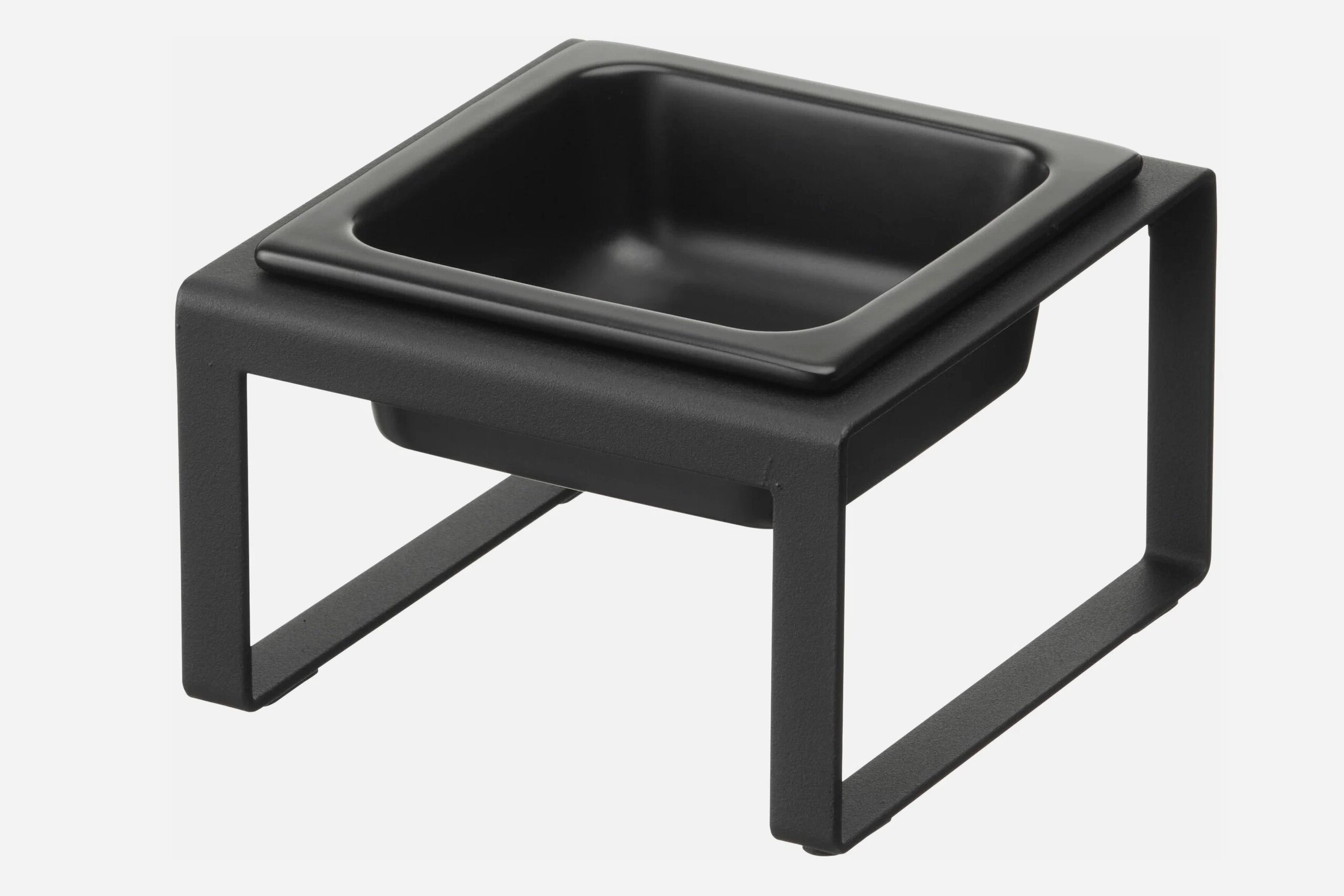 Тот же подход в выборе посуды для питомцев: отдайте предпочтение подставкам геометрической формы и мискам тёмных тонов.