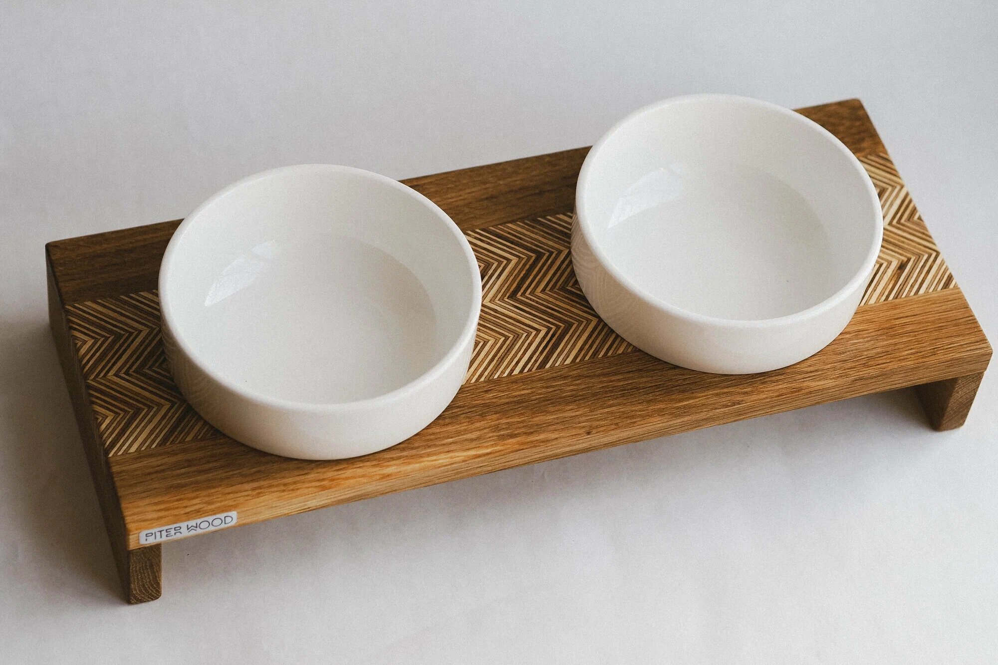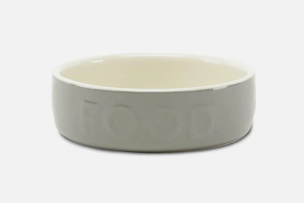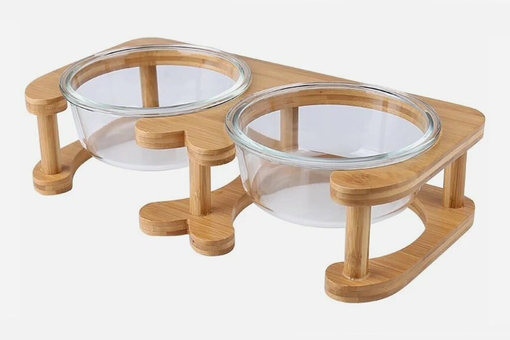Миски для любимцев — в тонах белого и серого. Также в этот стиль хорошо вписывается прозрачная посуда на деревянной подставке.