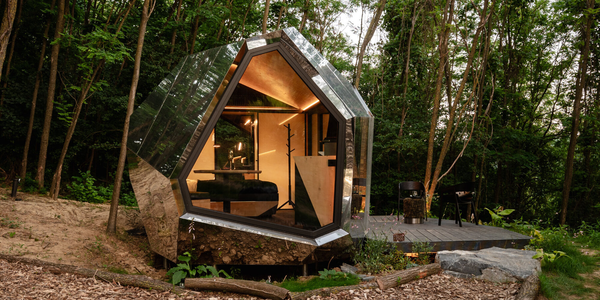 Жить в камне — отличная идея, если речь идёт о модульном доме PEBL Grand от студии Hello Wood. Правда, «камушек» для кемпинга сделан вовсе не из камня, а из дерева, скрытого под зеркальной поверхностью.