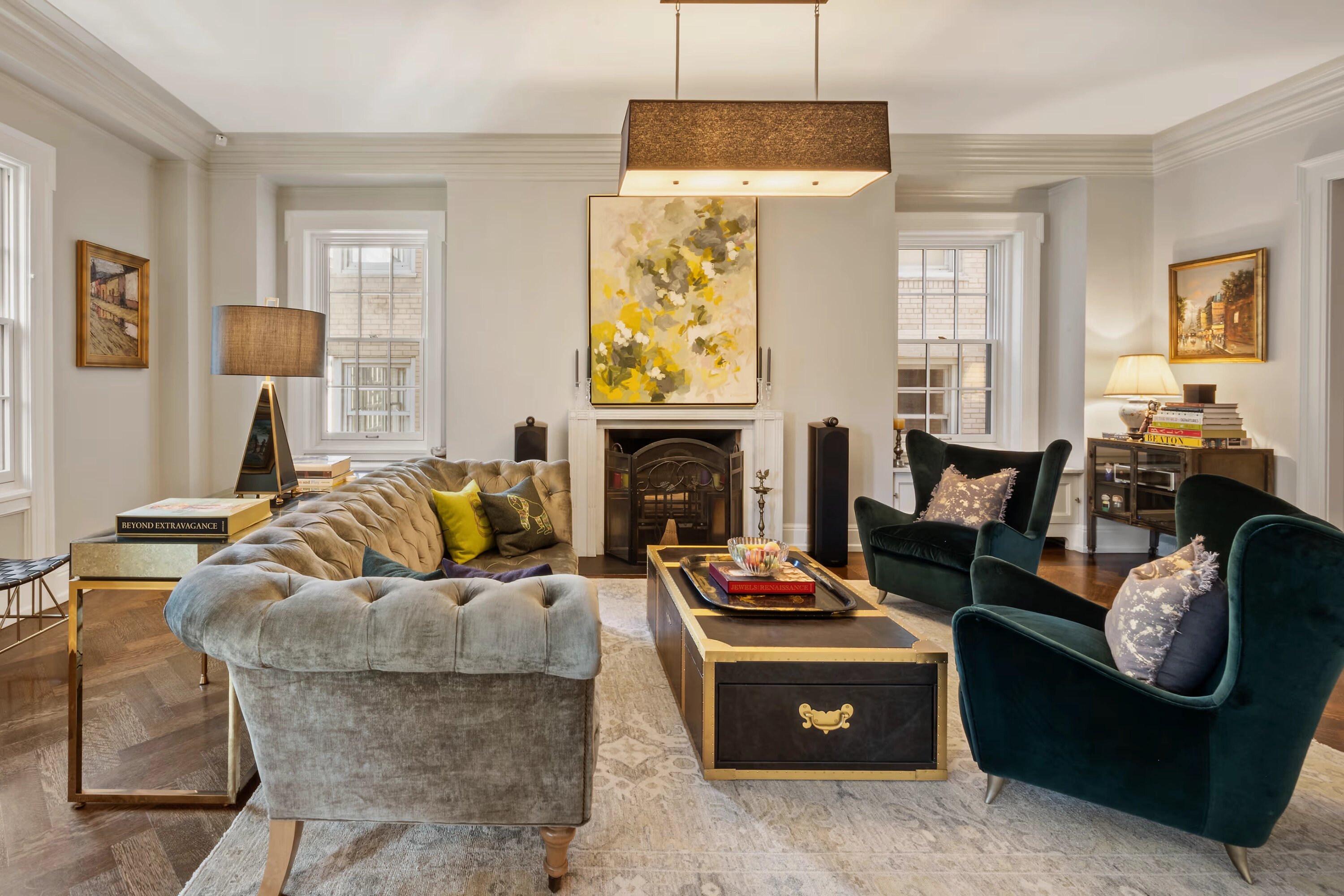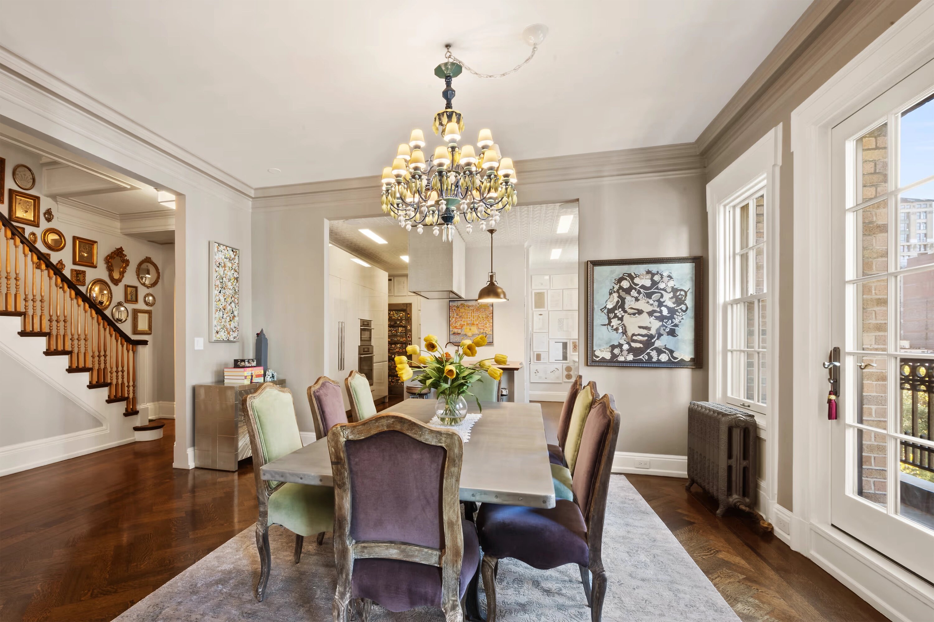 За последние 10 лет в квартире заменили окна и центральную систему кондиционирования воздуха. В прихожей находится красивая лестница, есть настоящая парадная столовая, угловая гостиная с камином на дровах, а также терраса. Высота потолков составляет 3 метра.
