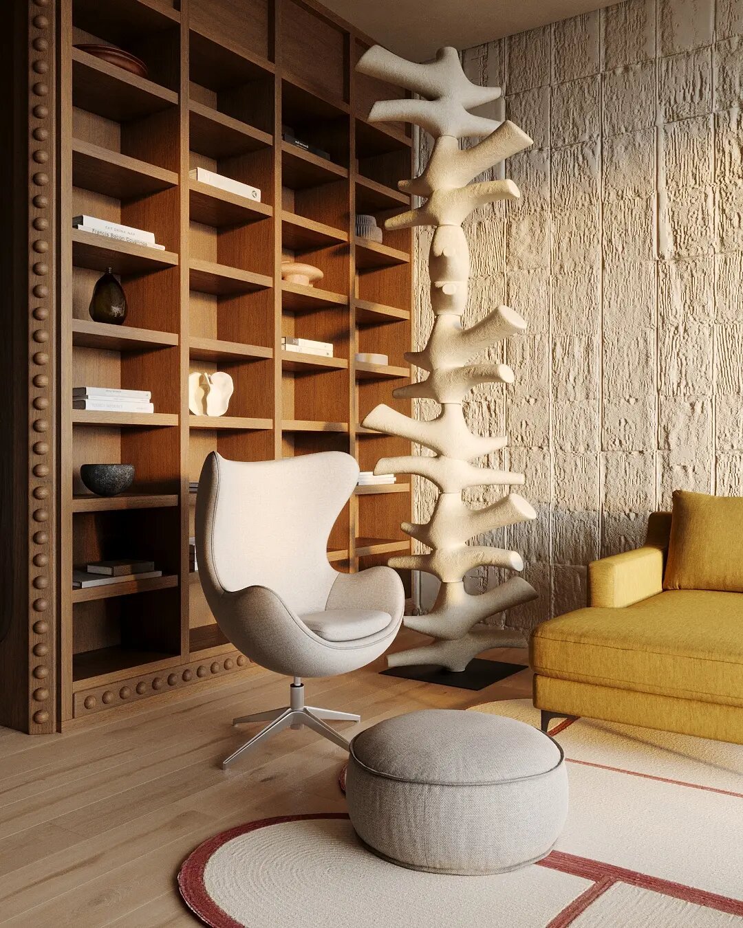 Форма кресла Egg от SKdesign настолько «говорящая», что достаточно только посмотреть на него, чтобы понять концепцию пространства — оно про будущее, полёты в космос и покорение неизведанного.