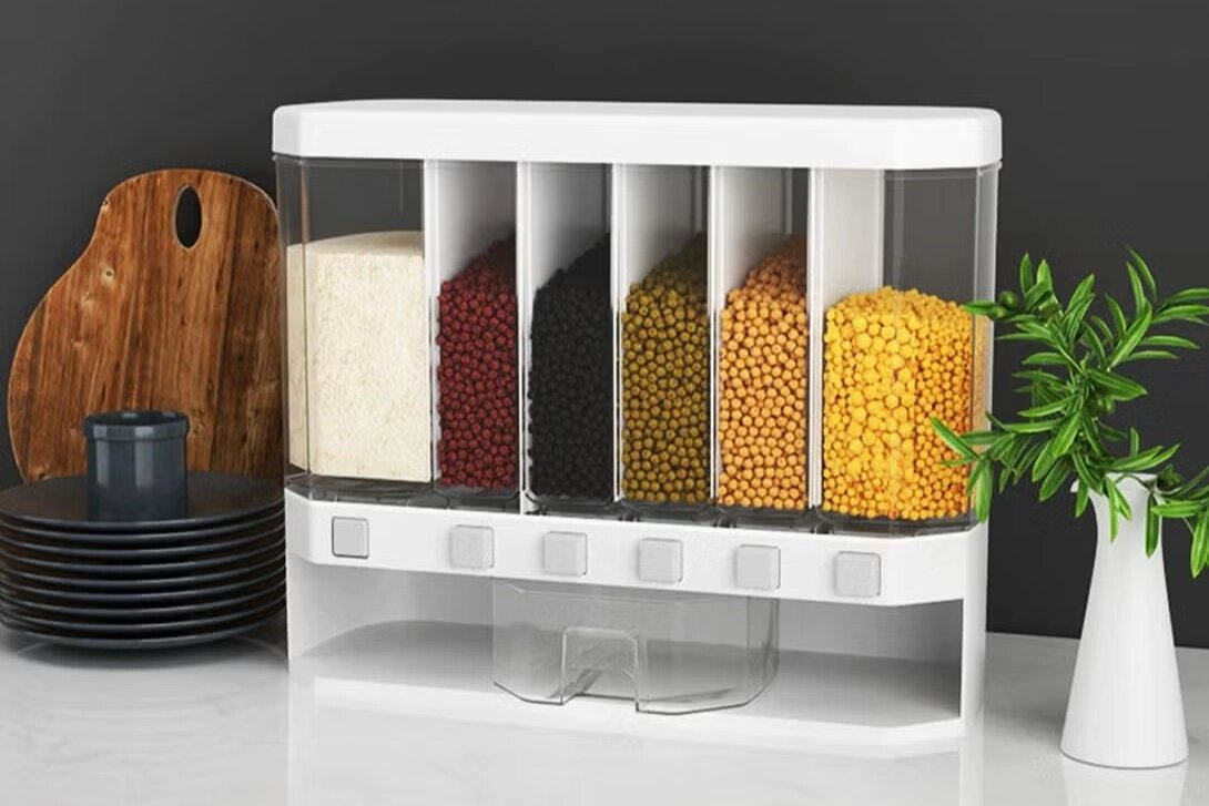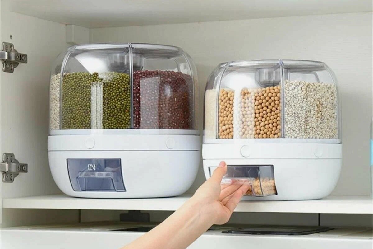 Кухонный диспенсер — это контейнер с разным количеством отсеков для хранения гречки, риса, полбы, муки и т. д. Благодаря дозатору в нижней части каждого отделения можно легко насыпать нужное количество продукта.