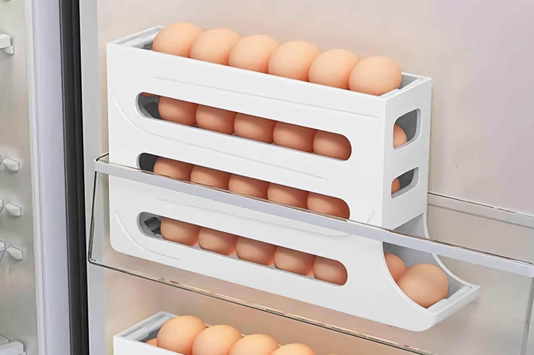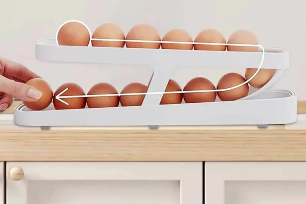 Если стандартный контейнер для яиц слегка наклонить — буквально на 5–10 градусов, получится удобная система с автоматической подачей. Вы достаёте одно яйцо, а следующее подкатывается и занимает его место на «выдаче». Лоток узкий, поэтому может встать как на полку, так и на дверцу холодильника. А благодаря обтекаемой форме и выверенному углу наклона яйца не бьются друг об друга и не трескаются.