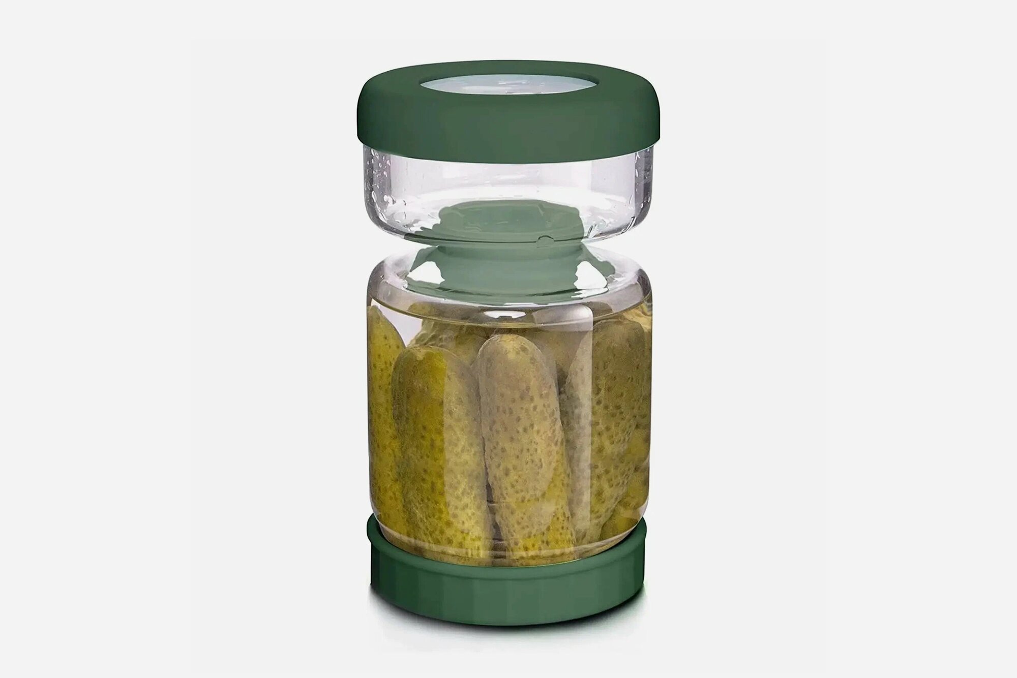 Контейнер для оливок и солений — это банка-перевёртыш, которая напоминает песочные часы, но «пересыпается» в ней не песок, а рассол. При подаче на стол ёмкость переворачивается таким образом, чтобы жидкость осталась в нижней части и было удобно брать овощи. На хранение она ставится другой стороной — рассол стекает вниз, покрывает продукты и не даёт им испортиться.