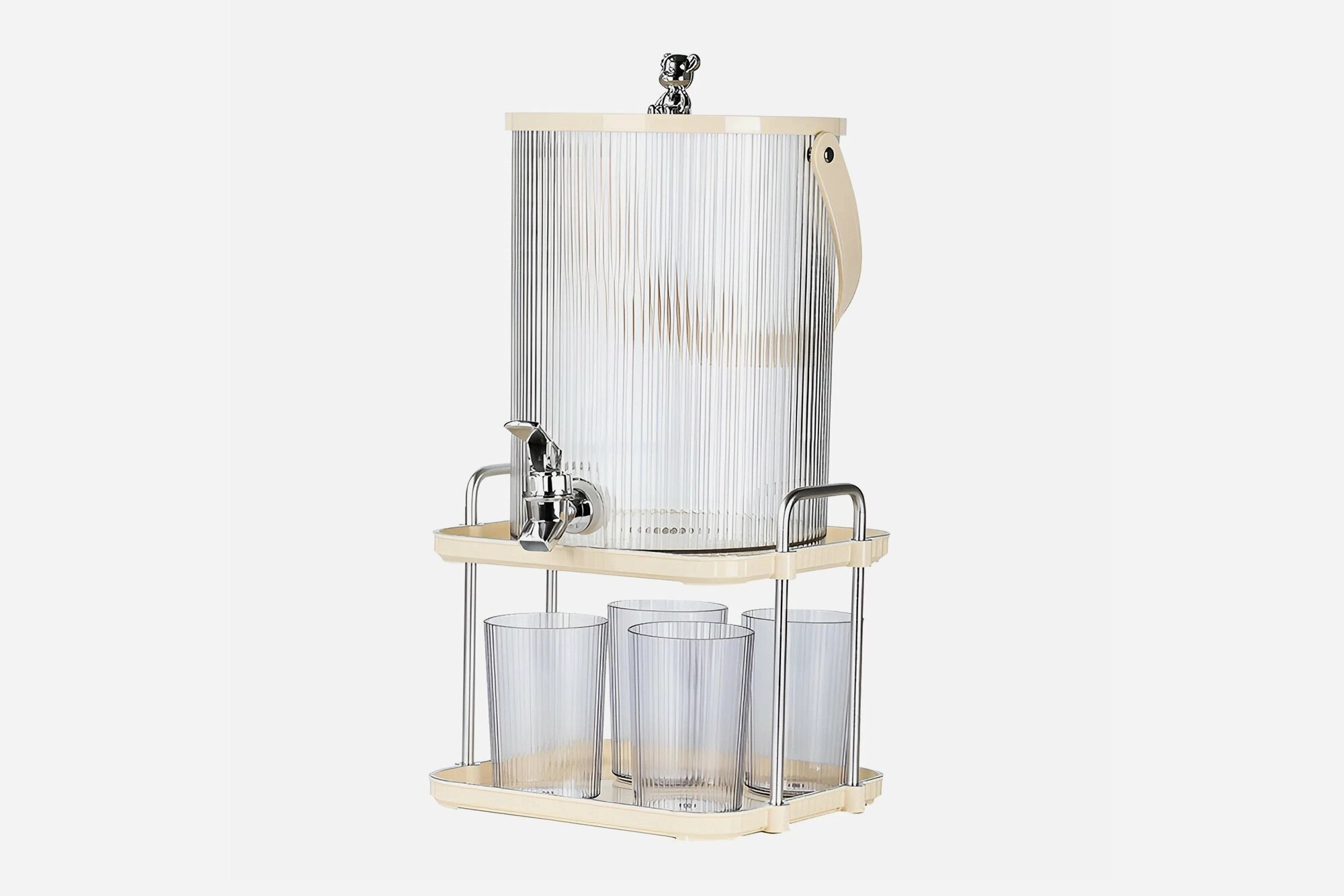Такие диспенсеры бывают разного объёма — чаще на 3,5–5 литров, а их форма — квадратная или прямоугольная, позволяет легко разместить ёмкость в холодильнике и не загромоздить его. Опционально контейнер оснащается противоскользящими ножками, подставкой для устойчивости и съёмным фильтром, который препятствует попаданию в стакан кусочков фруктов, трав и овощей.