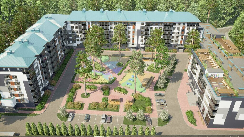 Двор. Внутреннее пространство апарт-комплекса разбито на несколько отличающихся по назначению зон. Здесь разместятся спортивная и детская площадки, зоны отдыха с беседками, места для парковки автомобилей. На территории двора будет выполнено озеленение.