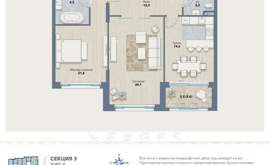 Площади квартир в клубном доме большие — от 79,92 м² (1-комнатные) до 289,6 м² (6-комнатные). Явные плюсы проекта — просторные лоджии и террасы, панорамные окна в каждой комнате (3,2 на 3,3 м), нестандартные планировочные решения.