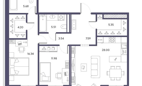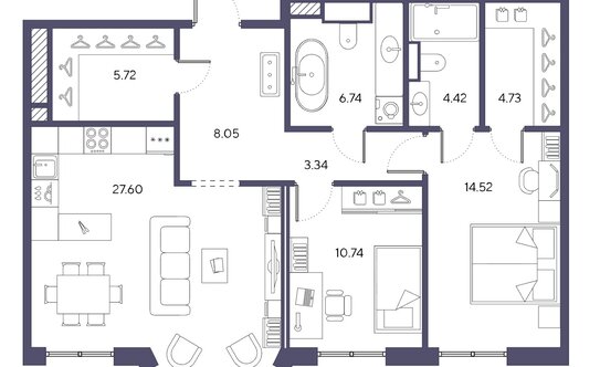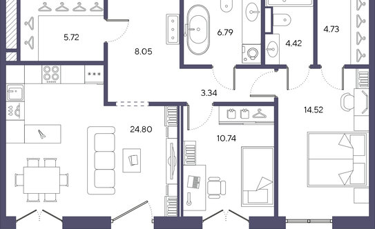 В ЖК можно выбрать 1–3-комнатные квартиры площадью от 52 до 122 м². Застройщик предлагает покупателям необычные планировки: помещения с эркерами, французскими балконами, угловыми и фронтальными террасами, а также двухуровневые квартиры. Высота потолков на 1–8 этажах — 2,98 м, на девятом — 3,65 м.