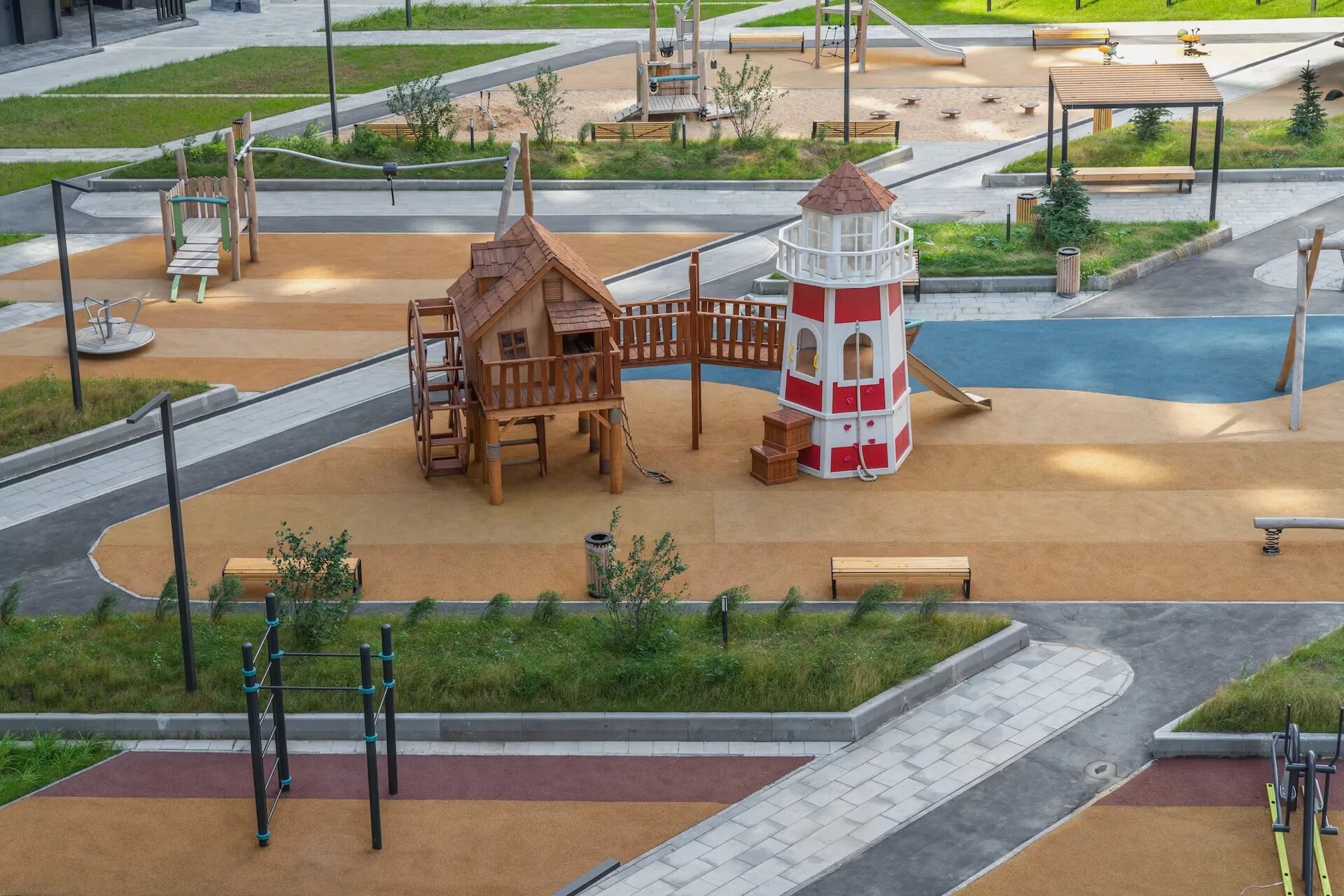 Дворы. Корпуса ЖК образуют закрытые дворы, где нет машин и посторонних. В каждом дворе оборудованы площадки для детей разных возрастов. Также есть воркаут-зона с тренажёрами и стол для настольного тенниса. На всей территории комплекса установлены камеры видеонаблюдения.